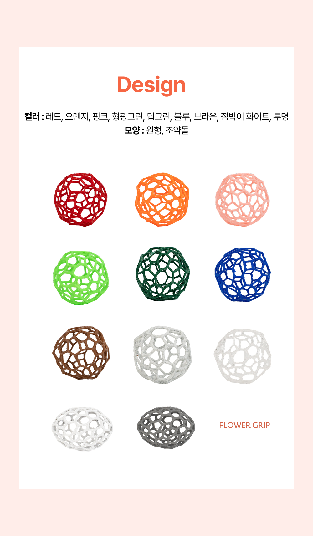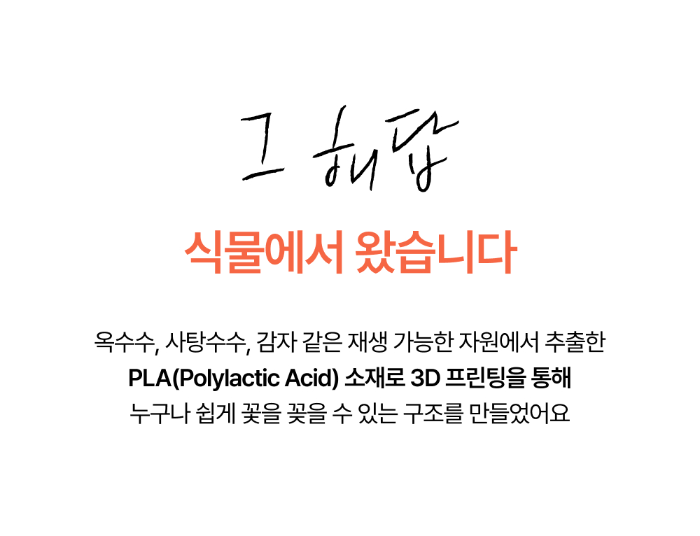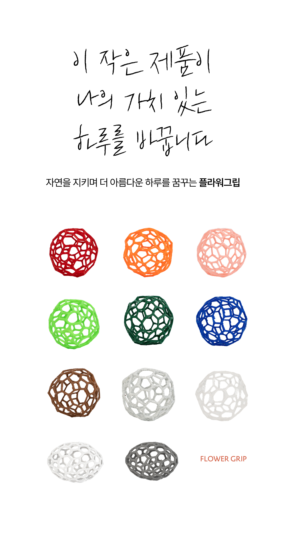 그 물음에 대한 답을 찾기 위해 저는 3D프린팅 기술과 생분해성 PLA 소재를 활용해, 기존 플로럴폼의 고정역할을 대체할 수 있는 친환경 '플라워그립'을 개발했습니다. 누구나 쉽게 사용할 수 있도록 구조를 디자인했고, 꽃을 오래도록 아름답게 고정하면서도 자연으로 돌아가는 제품을 만들기 위해 수개월간의 시행착오를 거쳤습니다. 이제는 더 많은 사람들이 이 제품을 통해 꽃을 부담 없이, 환경을 해치지 않고 즐길 수 있기를 바랍니다.