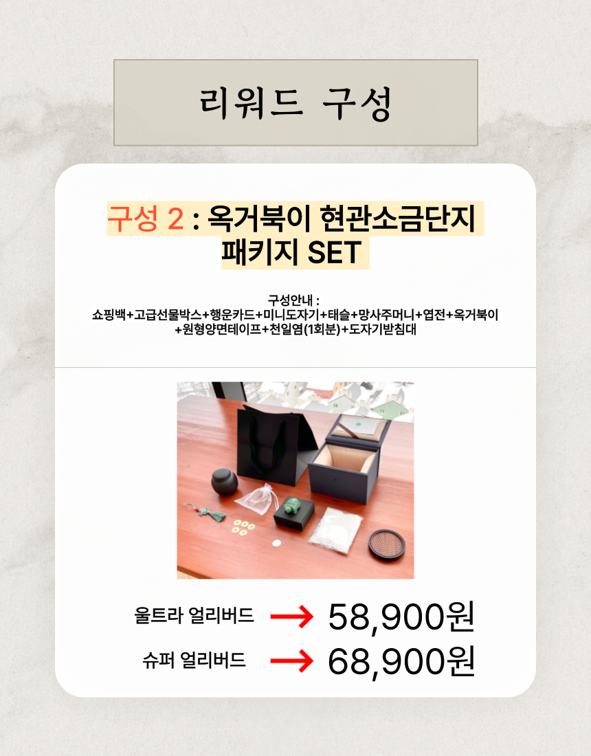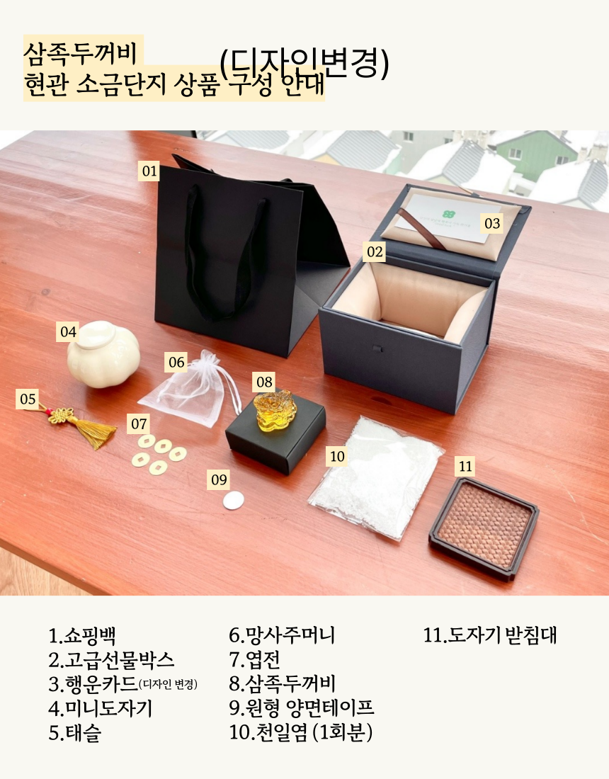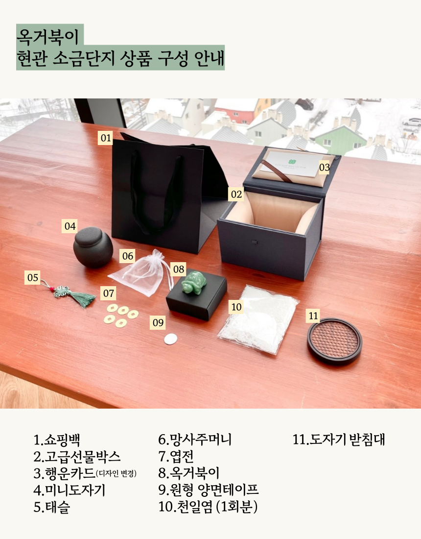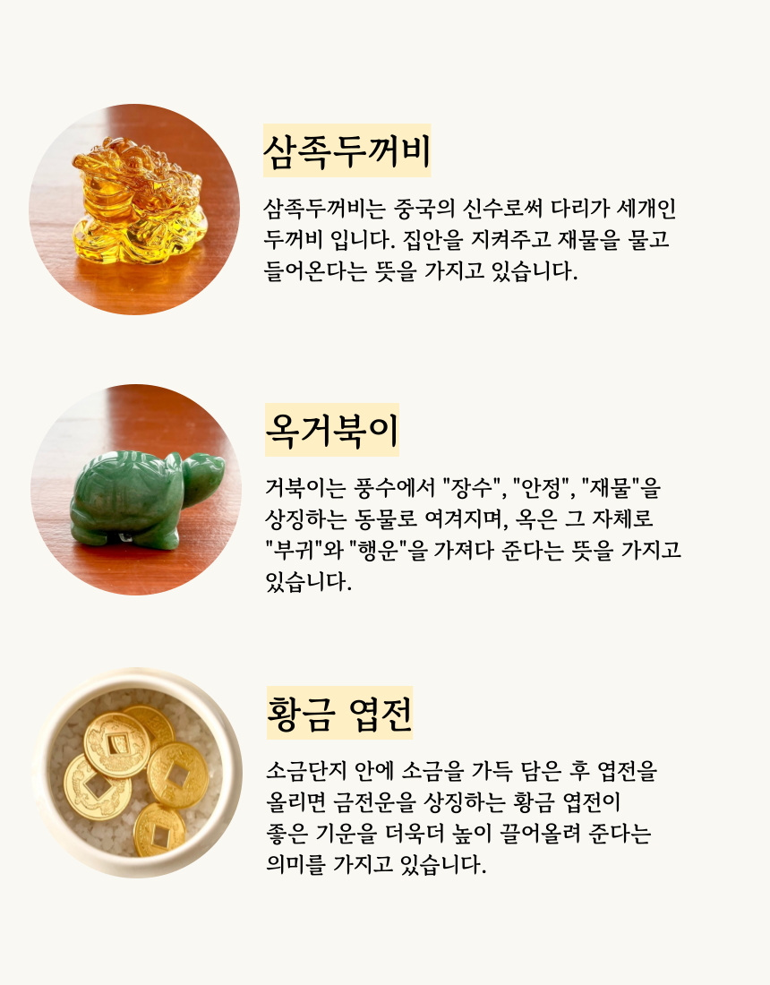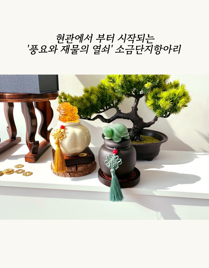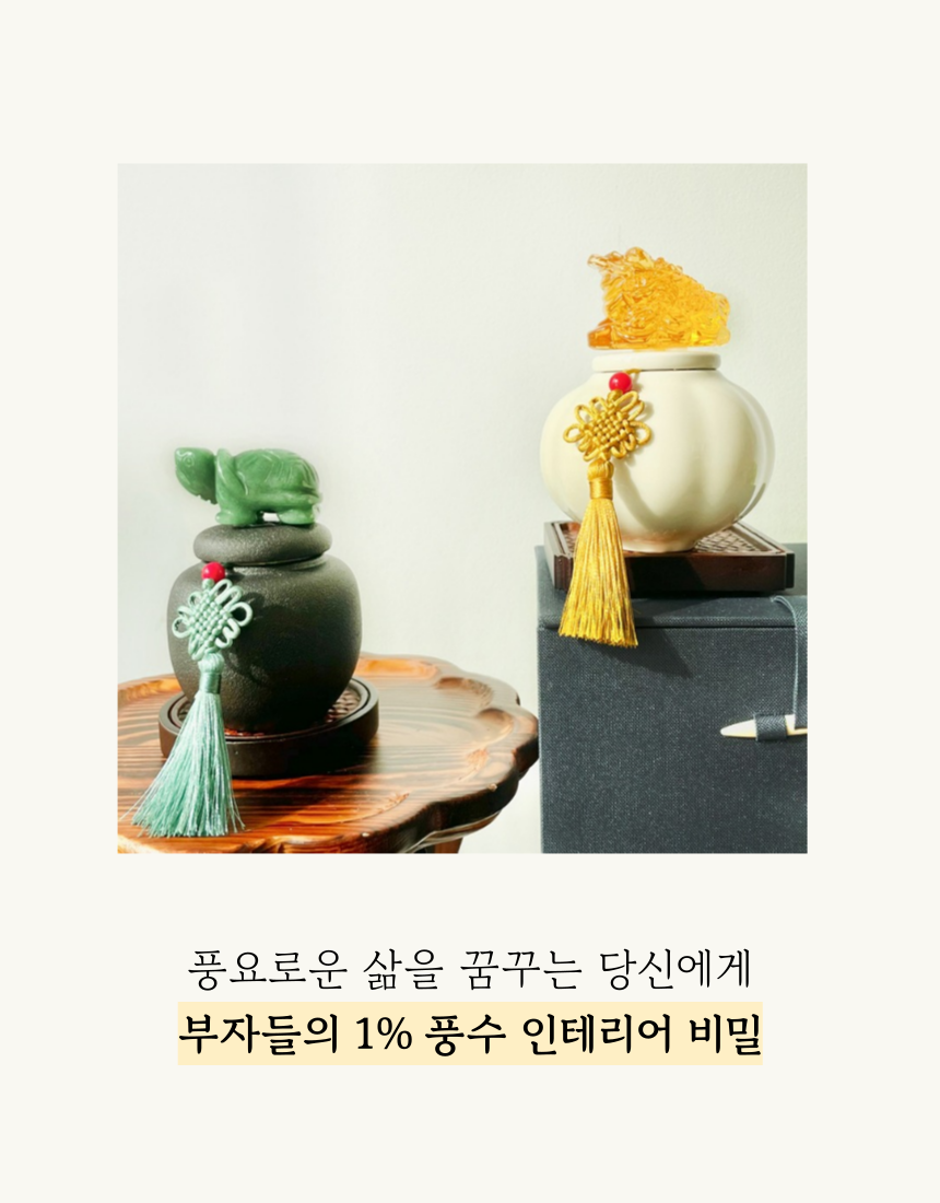1. 🏠 현관 소금단지 풍수 인테리어 - 전통과 현대가 조화된 재물과 풍요 상징 인테리어 소품 2. 🧧 부자들의 1% 풍수 비밀 - 삼족두꺼비와 옥거북이로 집안의 재물운과 행운을 증진 3. 🎁 고급 선물 세트 구성 - 행운카드, 미니도자기 등 다양한 부자재 포함 얼리버드 할인