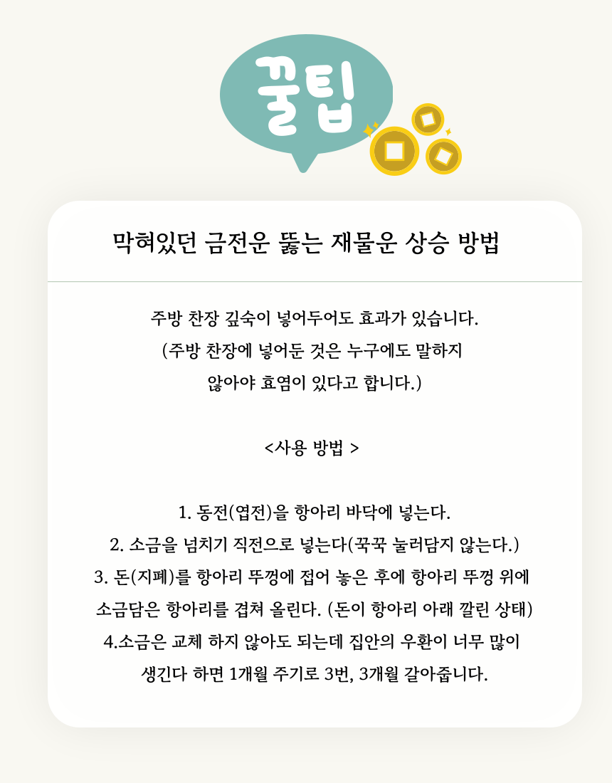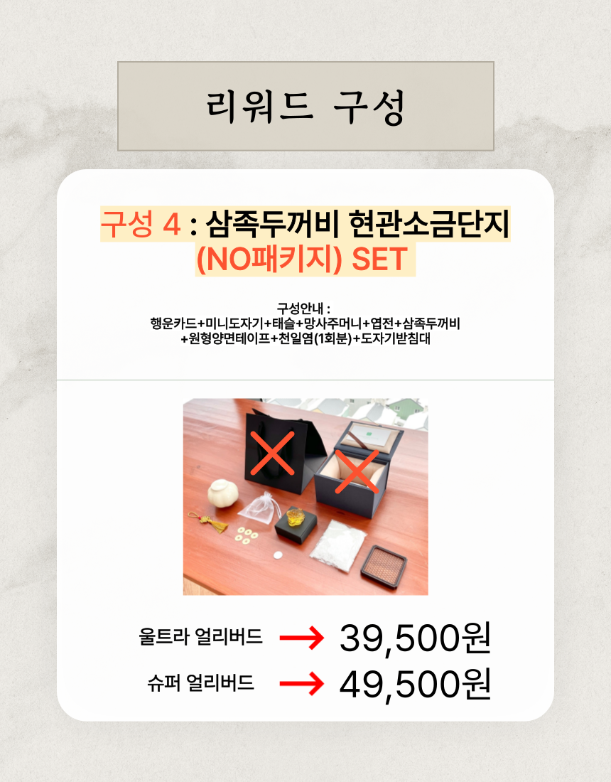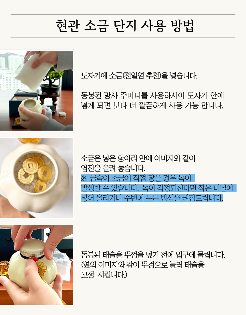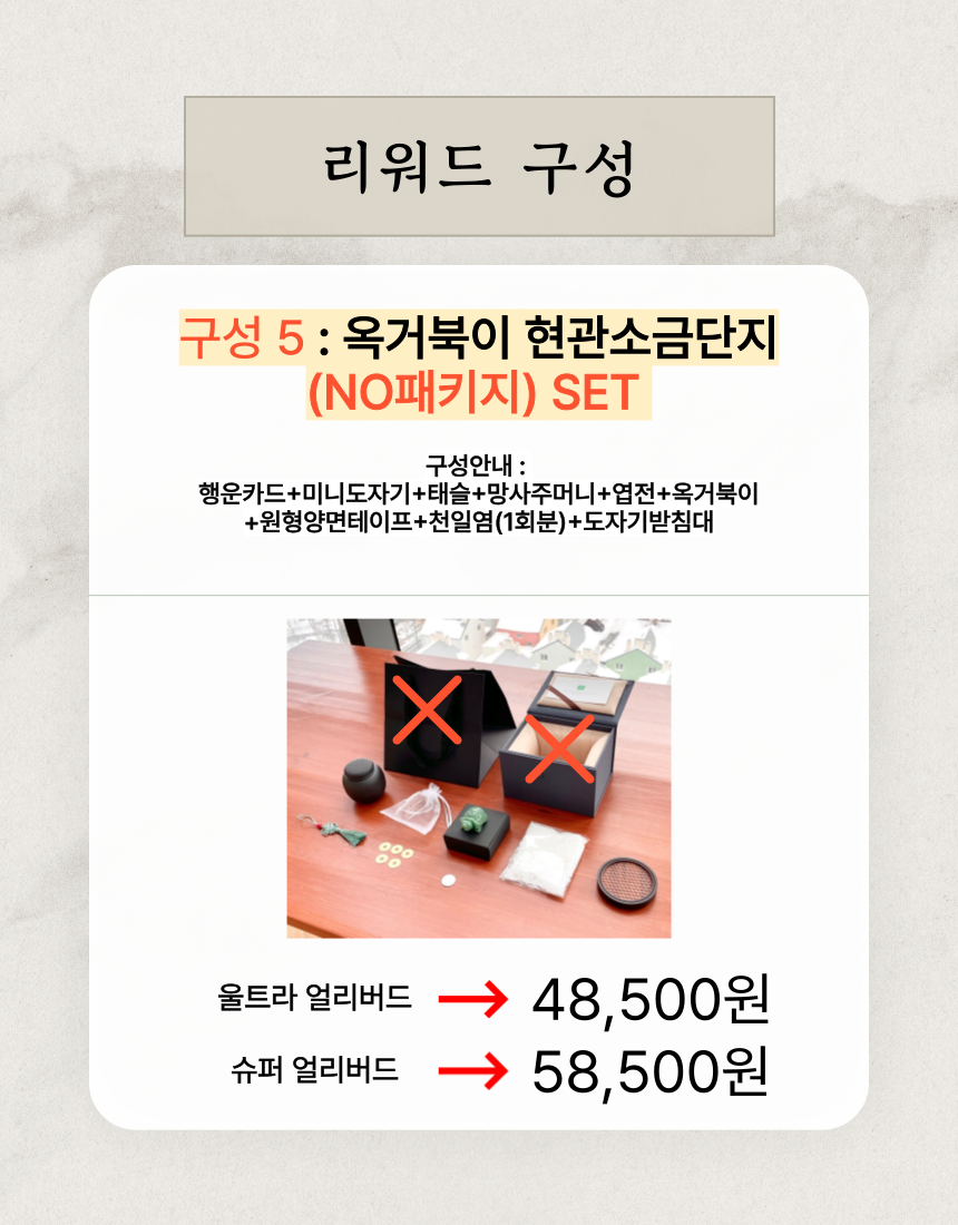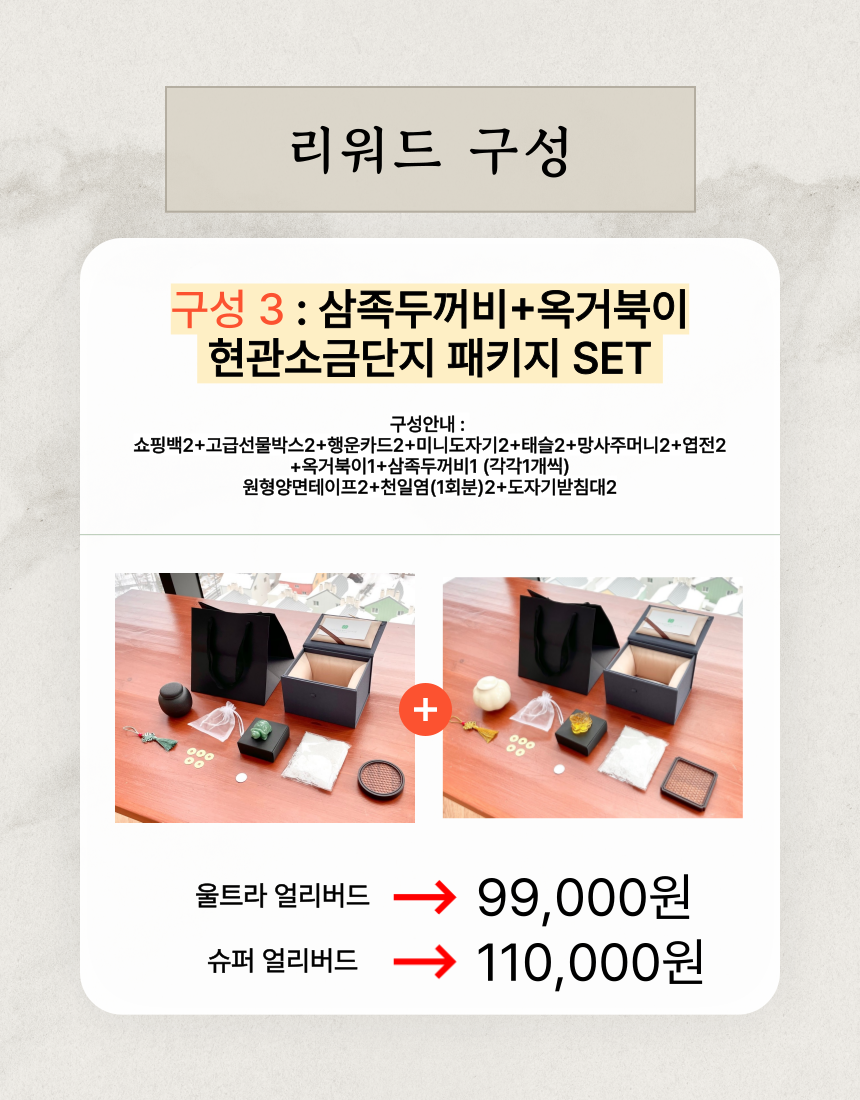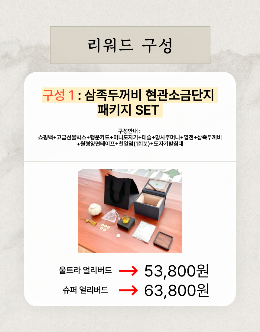 1. 🏠 현관 소금단지 풍수 인테리어 - 전통과 현대가 조화된 재물과 풍요 상징 인테리어 소품 2. 🧧 부자들의 1% 풍수 비밀 - 삼족두꺼비와 옥거북이로 집안의 재물운과 행운을 증진 3. 🎁 고급 선물 세트 구성 - 행운카드, 미니도자기 등 다양한 부자재 포함 얼리버드 할인
