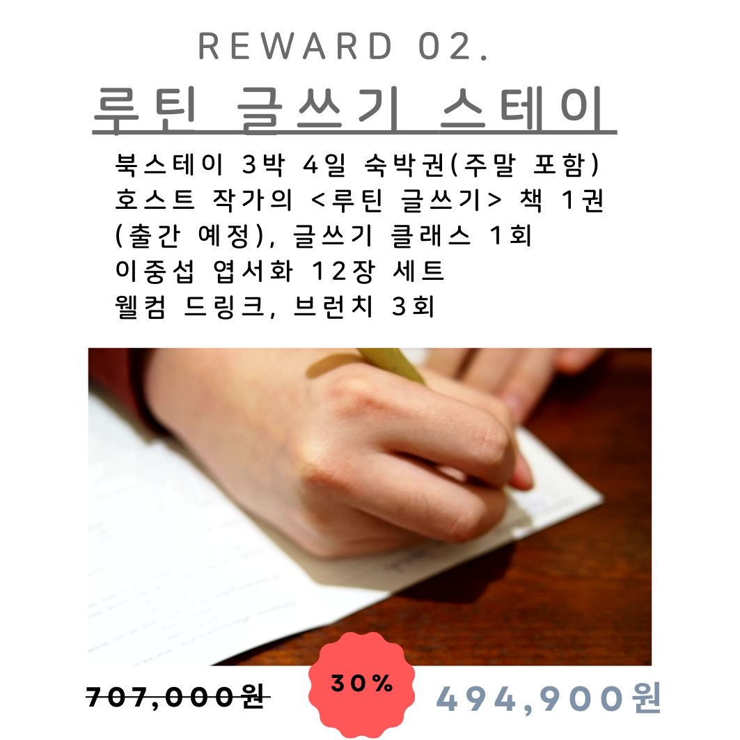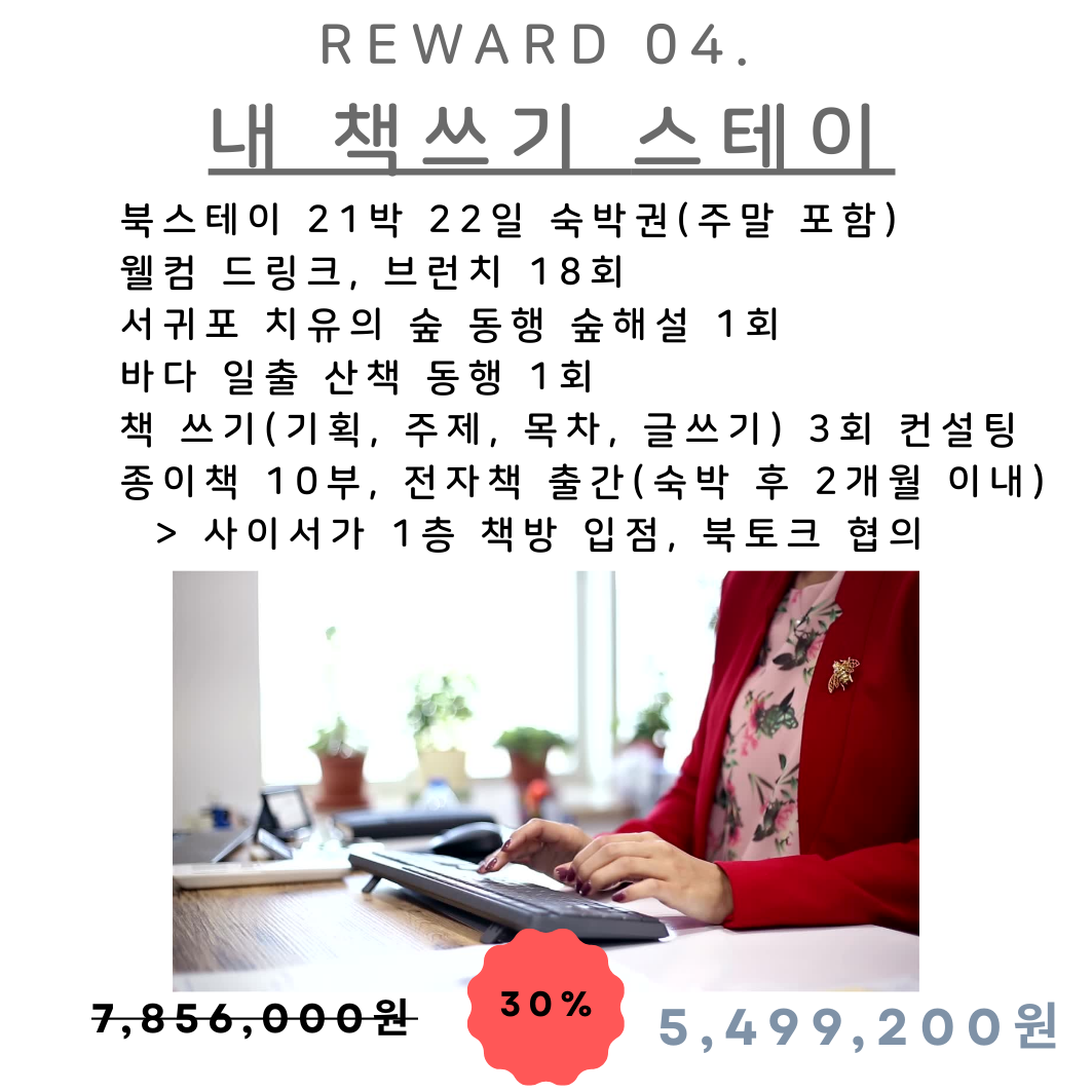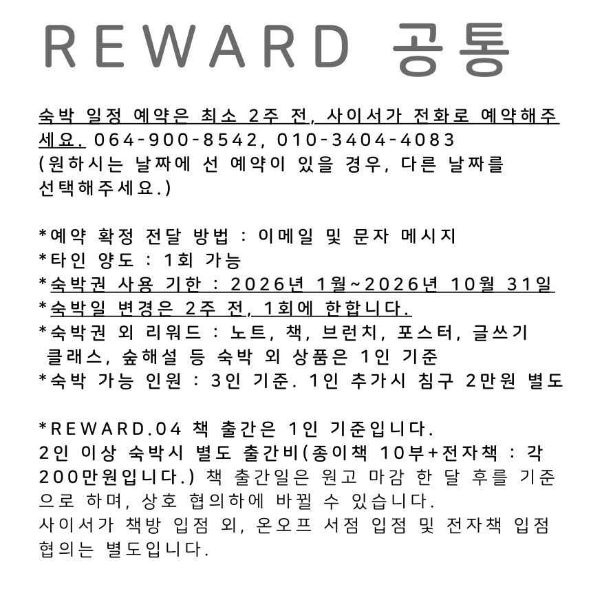 *REWARD.04 : 종이책은 2도 인쇄, 200페이지 이내, B6 또는 4X6판형(128 x 182 mm) 기준입니다. 인쇄 사양이 달라질 경우 별도 협의합니다.