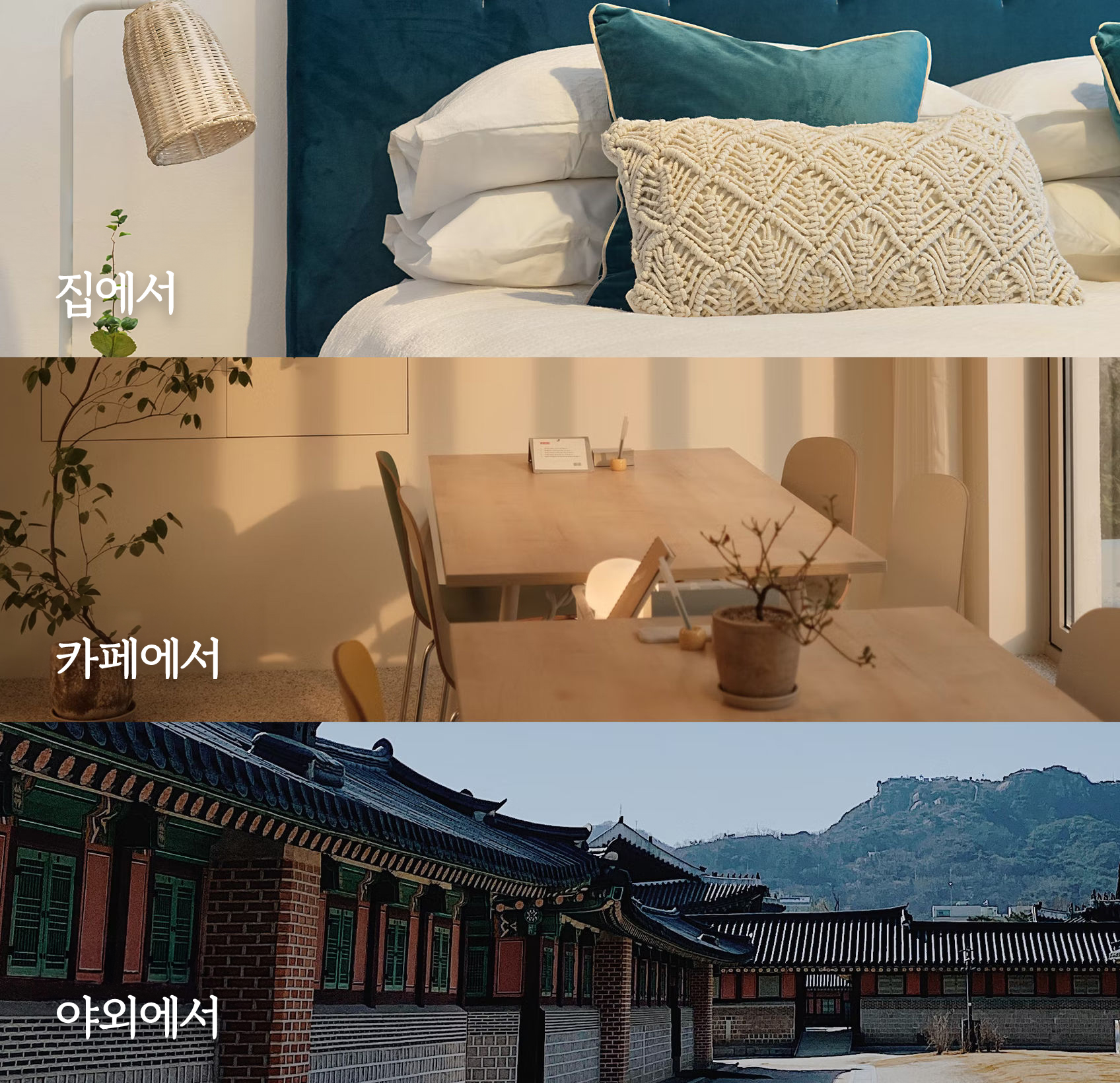 집에서, 카페에서, 야외에서.