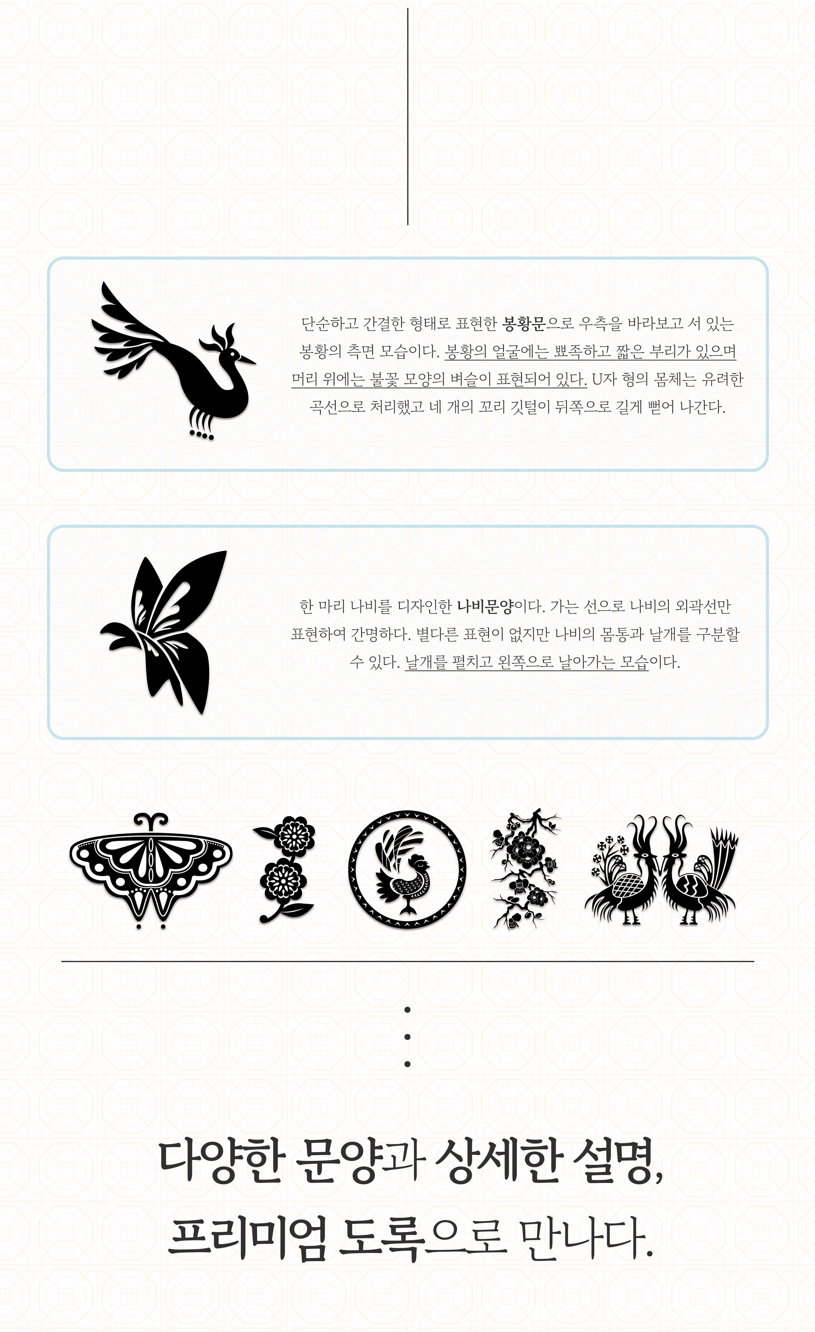 우리 선조들이 계승해온 아름다움의 정수, 한국의 전통 문양을 한 권에 담은 프로젝트 입니다. - 프리미엄 도록
