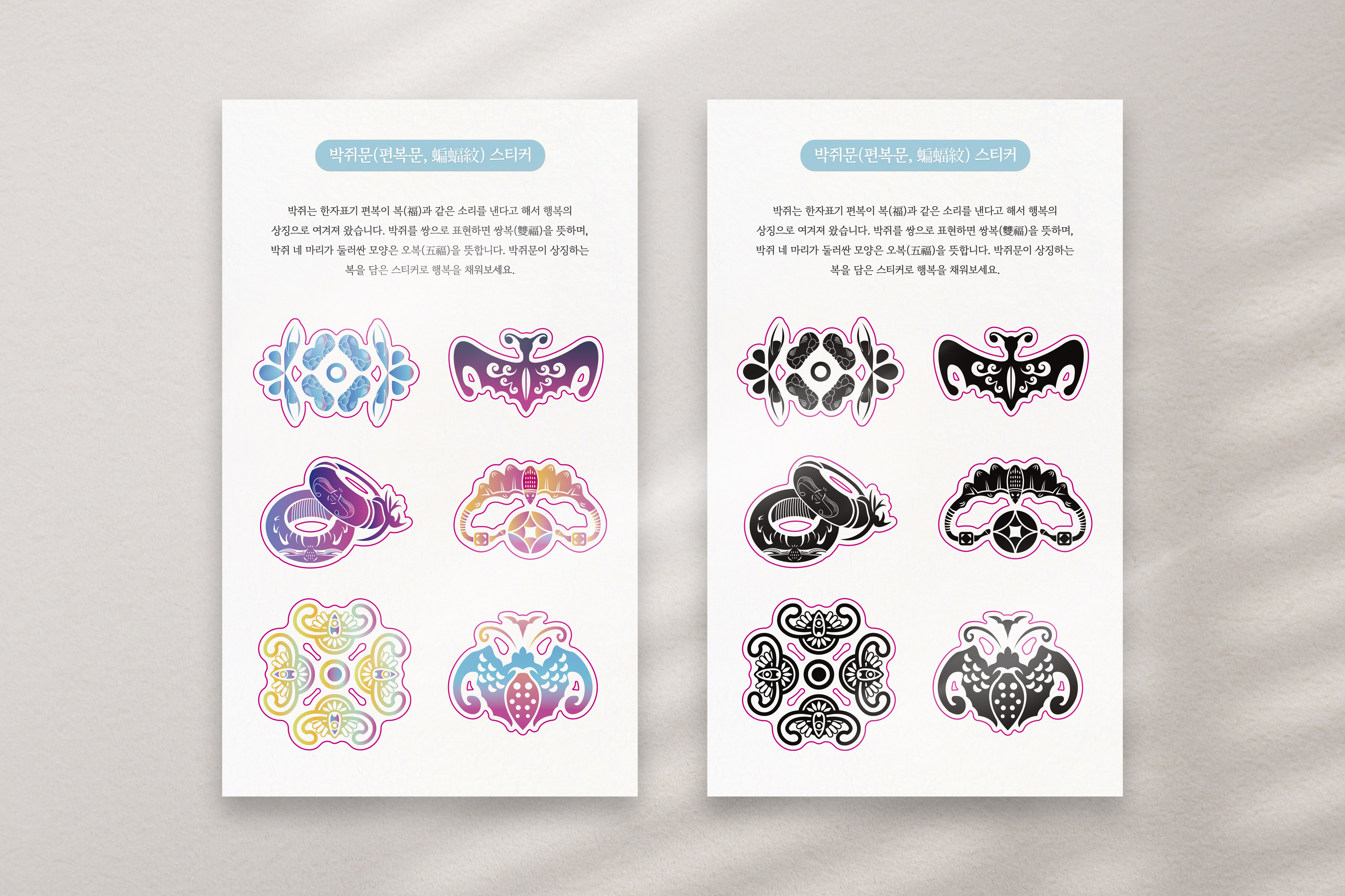 박쥐문은 전통적으로 행운과 복을 상징한다고 합니다. 쌍박쥐는 쌍복(雙福), 네 마리 박쥐는 오복(五福)이라고 하여 더욱 풍성한 행복을 선사한다는 의미가 있죠. 작은 소품이지만, 박쥐문 문양이 담긴 스티커를 여러가지로 꾸미시다 보면 행운이 찾아올지도 몰라요.