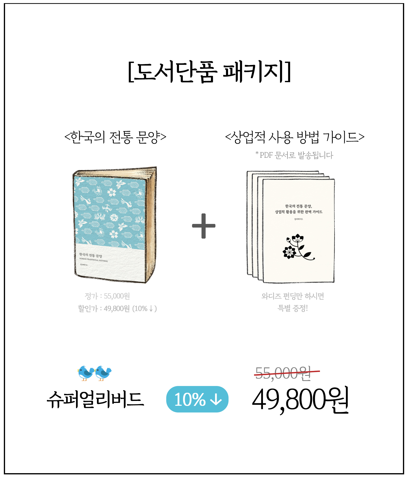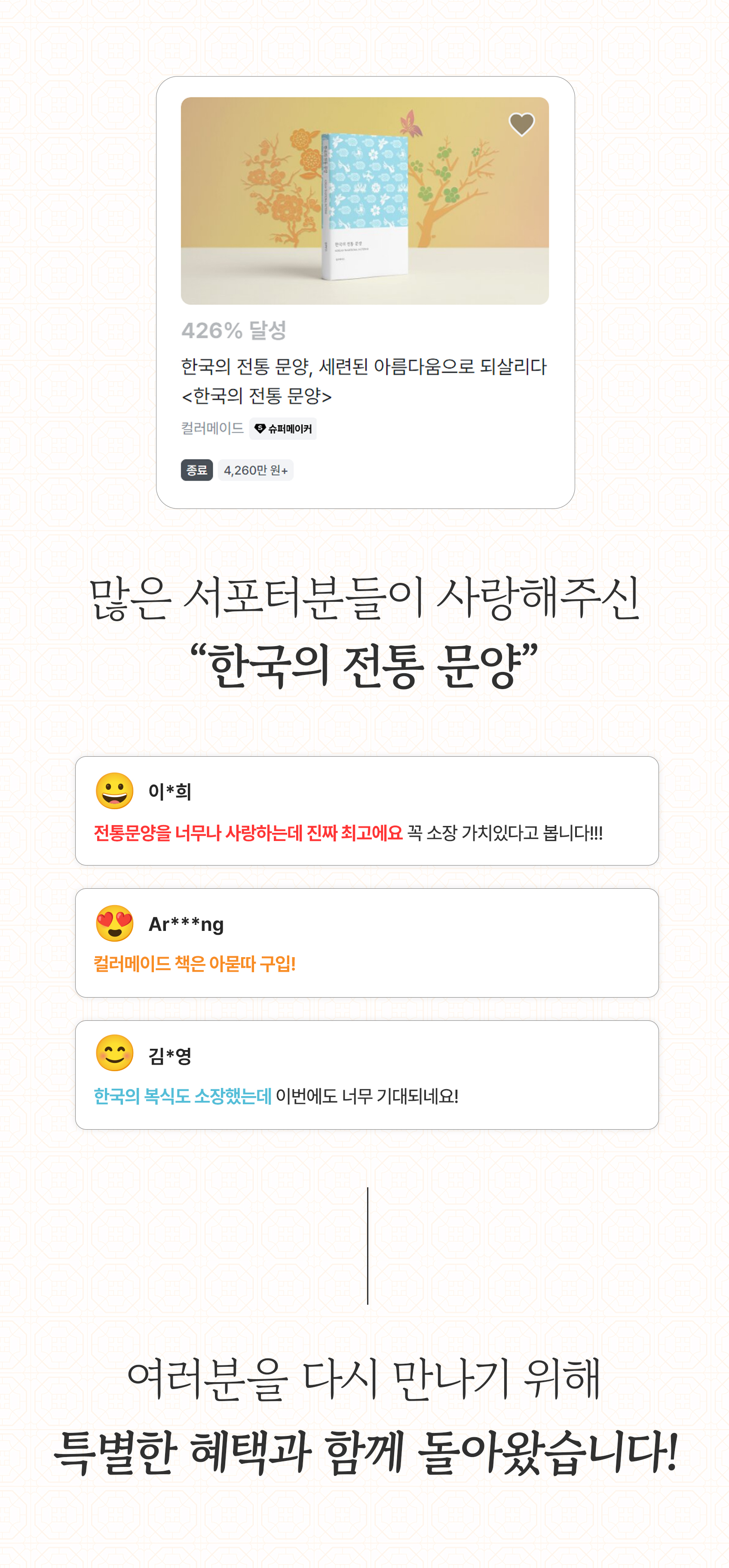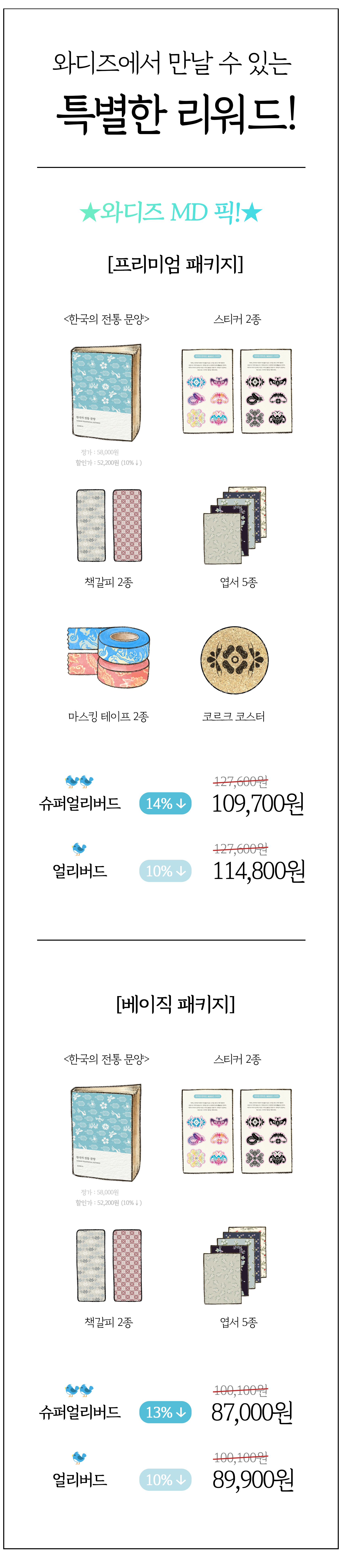 한국의 아름다운 전통 문양들이 한가득 들어있는 풀컬러 도록, 그리고 다양한 보너스 리워드.