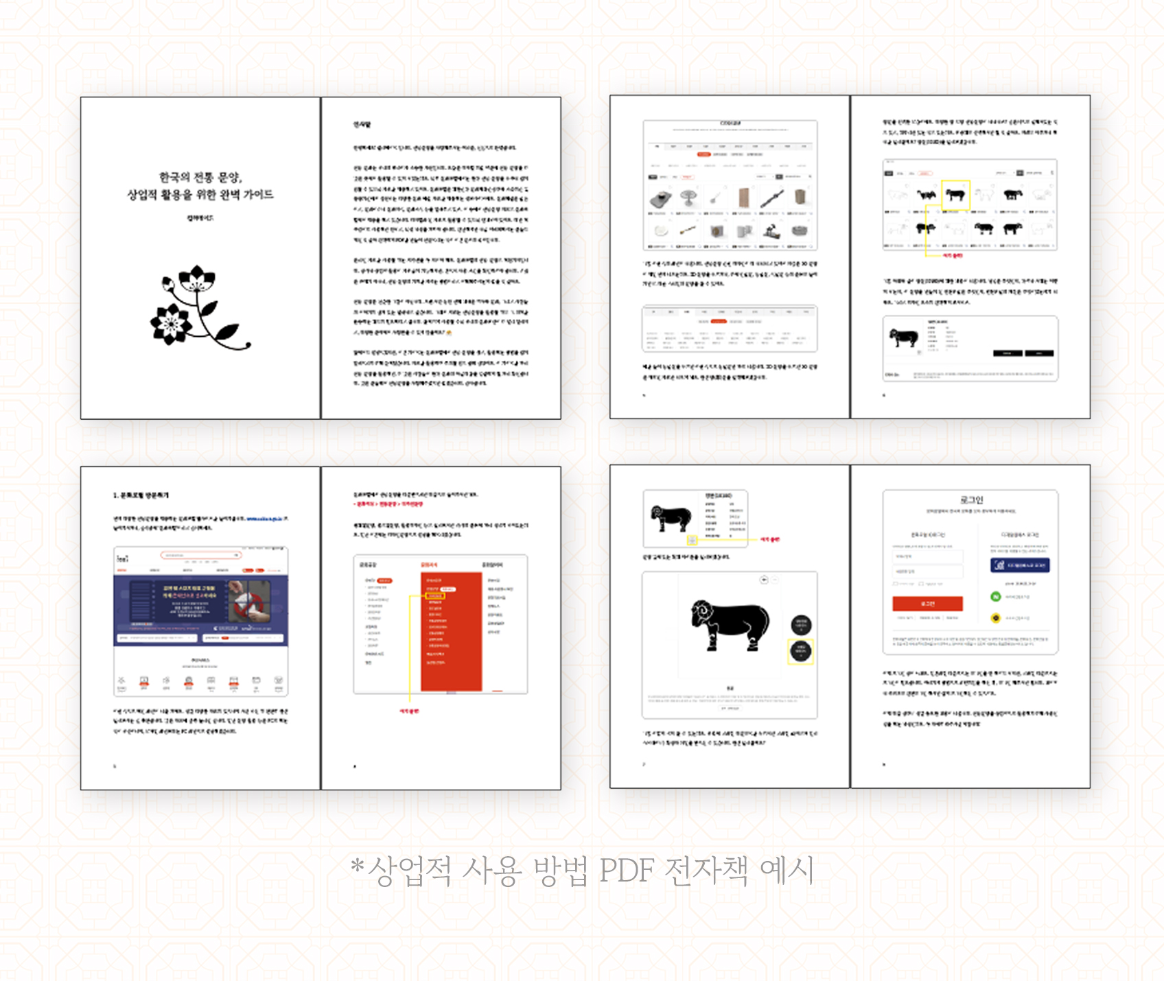 그동안 전통문양 자료를 상업적으로 활용하고 싶은 분들이 많이 계셨었는데요. 그래서 그런 분들을 위해 사용 방법을 전자책으로 만들었어요. 내용이 크게 거창하진 않지만, 저작권을 준수하면서도 전통문양을 어떻게 잘 사용할 수 있는지 간략하게 안내해주는 문서라고 보시면 됩니다. 아마 필요하신 분들은 유용하게 쓰실 수 있을 거예요!