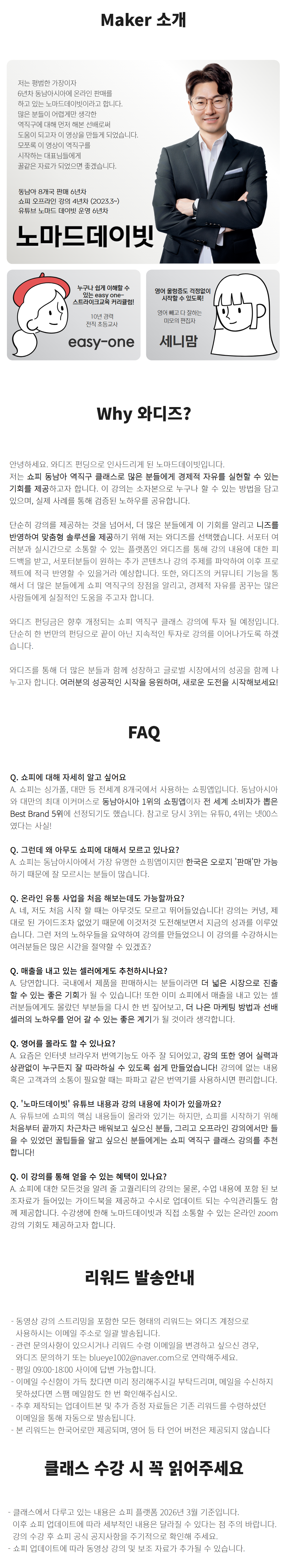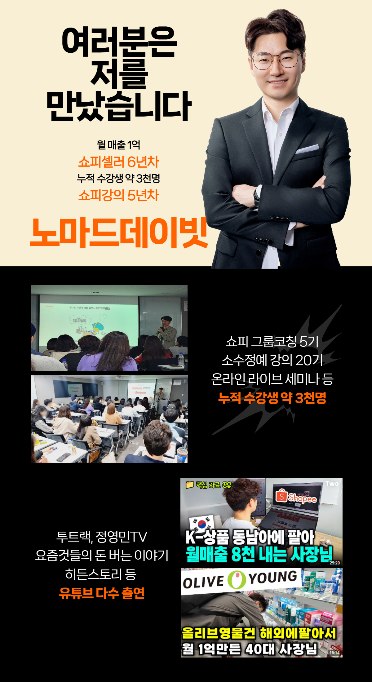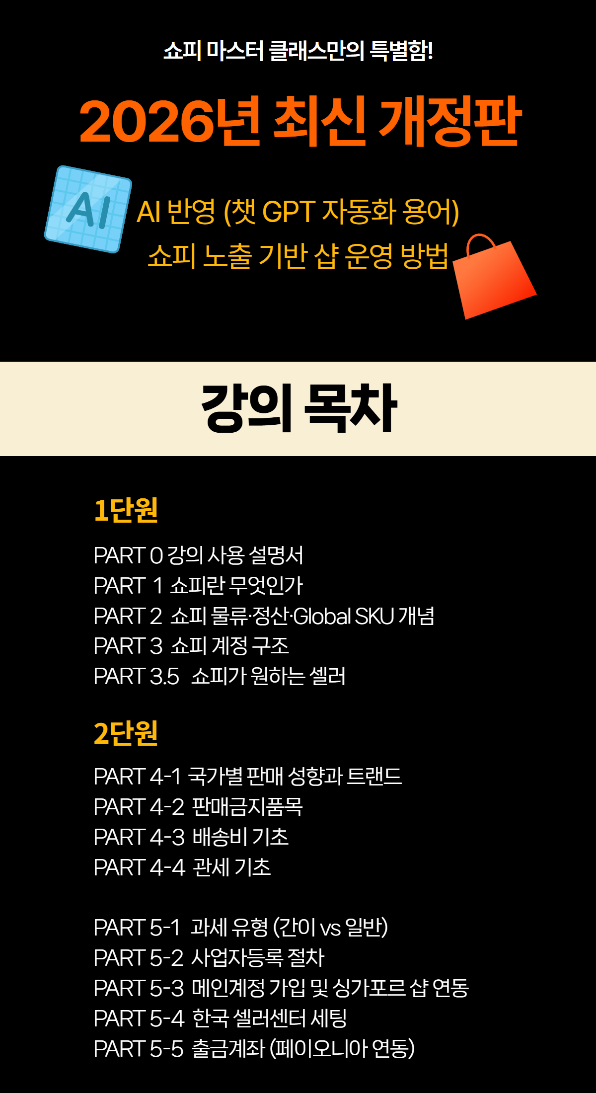 1. 📚 쇼피 마스터 클래스 강의 - 2026 최신 운영 로드맵과 AI 자동화 전략 포함 실전형 강의 2. 🚀 매출 상승과 운영 효율 개선 - 쇼피 구조 변화 반영, 단계별 실습으로 매출과 효율 동시 향상 3. 🎁 최신 개정판과 실시간 소통 혜택 - ZOOM 강의, 전자책 무료 제공, 실시간 피드백 포함 특별 구성