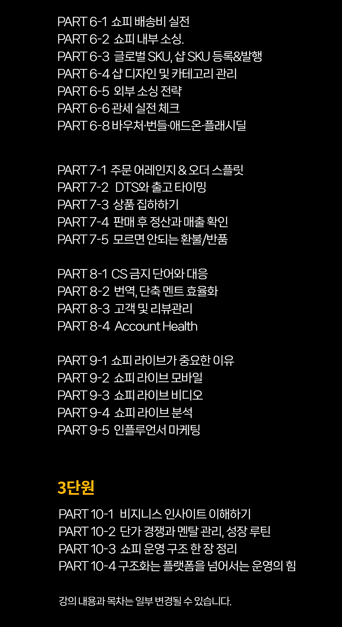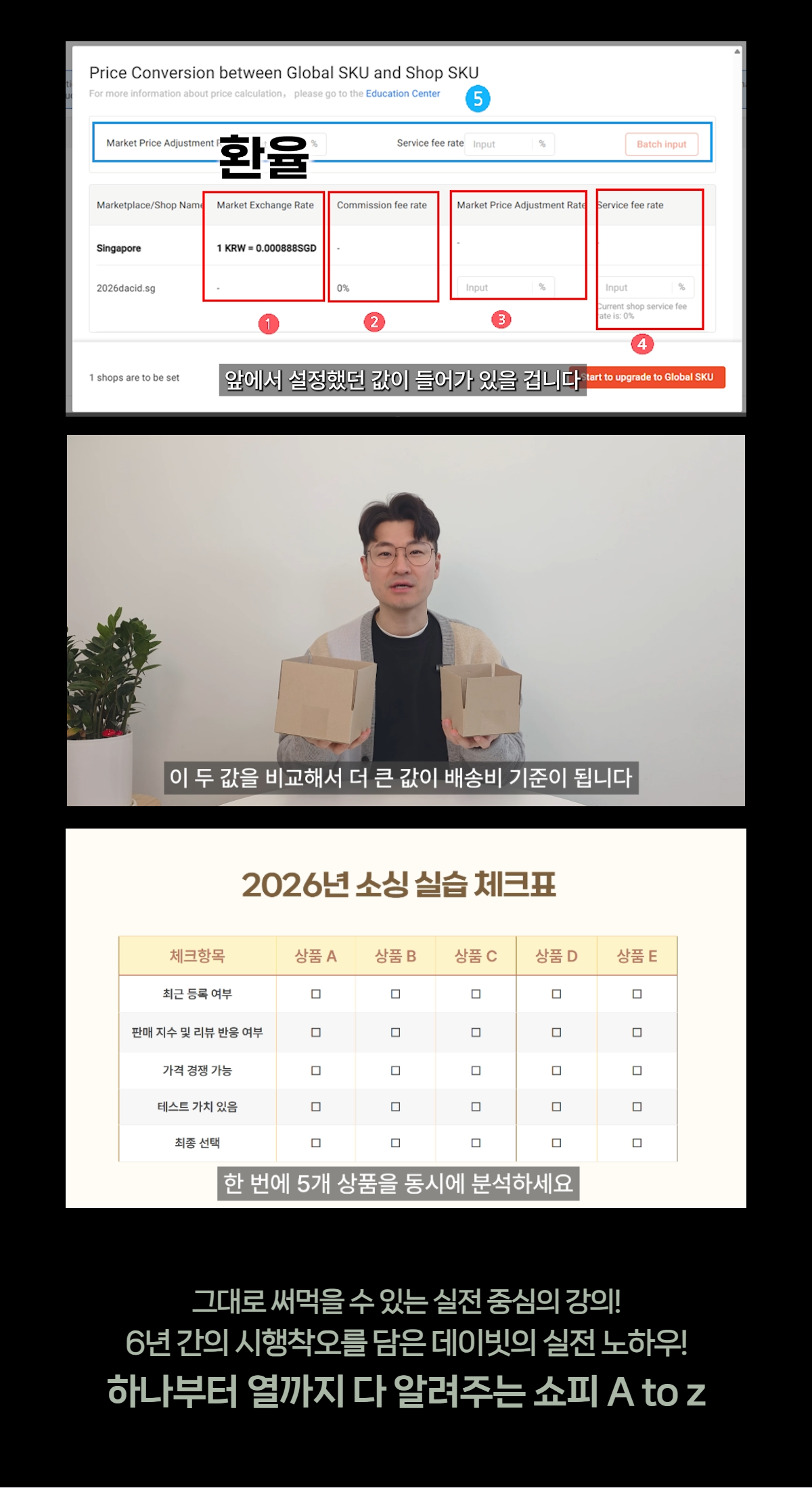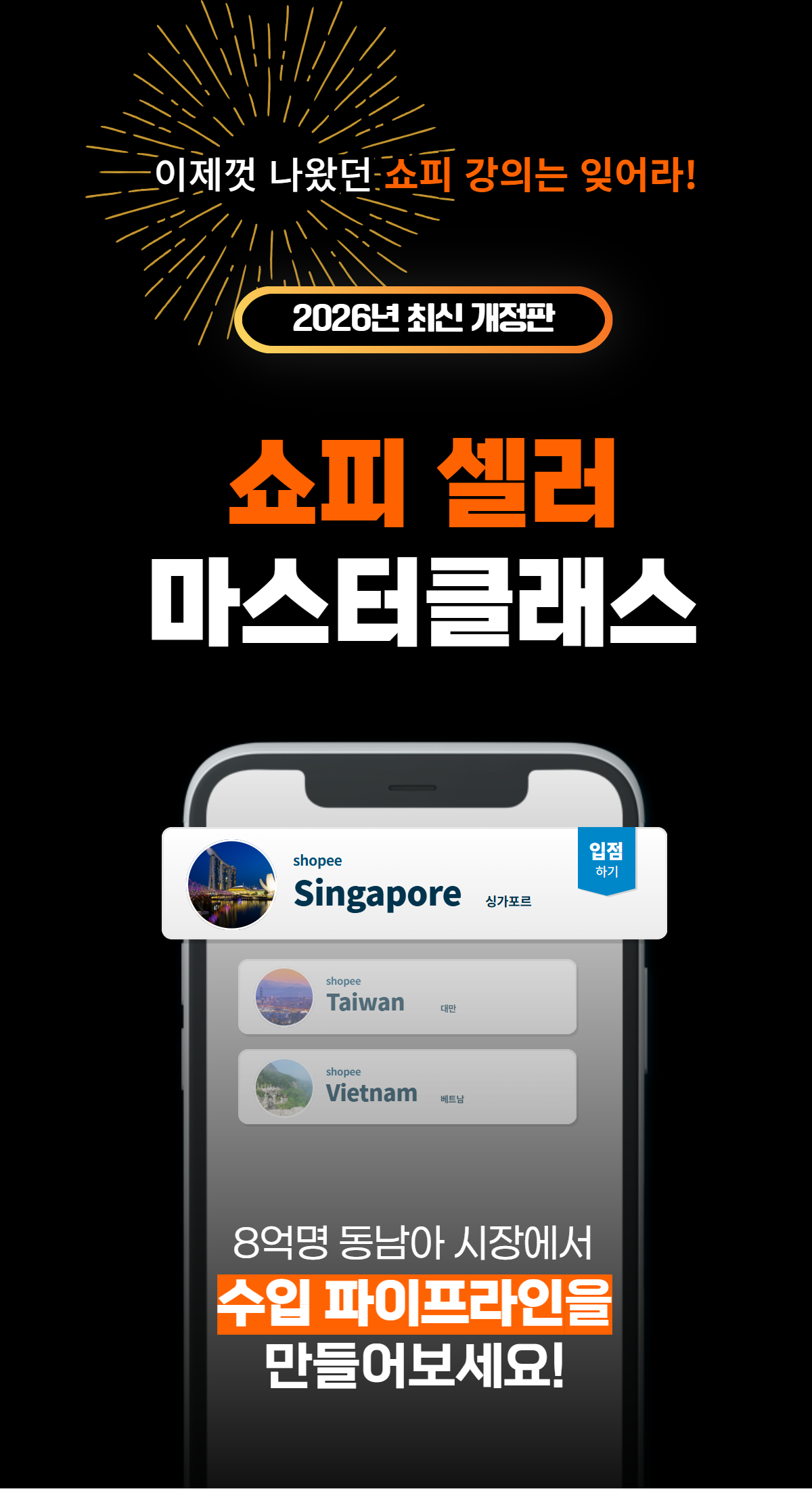 1. 📚 쇼피 마스터 클래스 강의 - 2026 최신 운영 로드맵과 AI 자동화 전략 포함 실전형 강의 2. 🚀 매출 상승과 운영 효율 개선 - 쇼피 구조 변화 반영, 단계별 실습으로 매출과 효율 동시 향상 3. 🎁 최신 개정판과 실시간 소통 혜택 - ZOOM 강의, 전자책 무료 제공, 실시간 피드백 포함 특별 구성