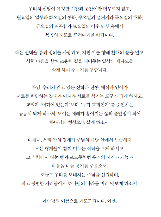 - 우리는 교회의 붉은 벽돌을 넘어 한 길의 동행자로 만났습니다. 2023년 시작한 교회 밖 작은 모임, '느슨한;00'은 신앙의 정답 대신 일상의 따뜻한 질문부터 나눴습니다. 그저 일상 안에서 청년의 신앙이 어떻게 흔들리고, 왜 동료가 필요하고, 형제애를 위한 용기는 무엇이어야 하는지 함께 고민하고 대화했습니다.