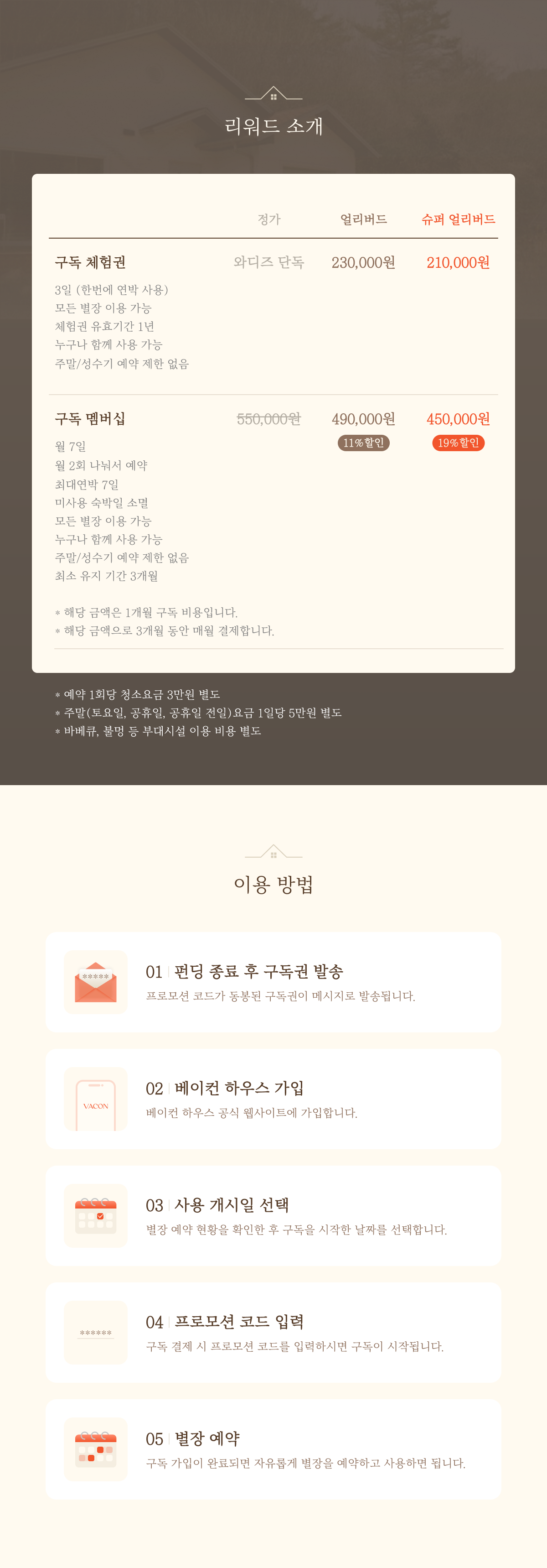 - 매월 구독 갱신일까지 사용하지 못한 숙박일은 소멸됩니다. 다만, 소멸되는 숙박일에 상응하는 혜택을 드리기 위해 구독료의 50%를 적립해 추후 별장 매입 또는 오너플랜(공동 소유형) 가입 시 적립금 만큼 할인 받을 수 있습니다. 체험권의 경우 유효기간인 1년 이내 미 사용 시 자동 소멸됩니다.
