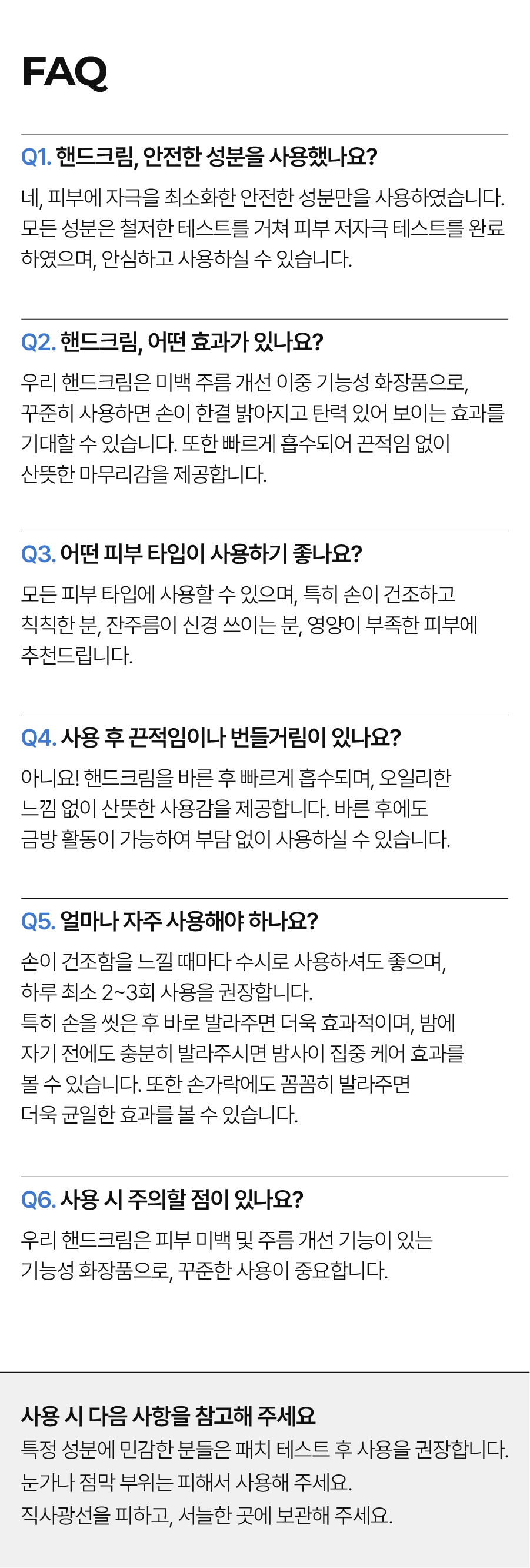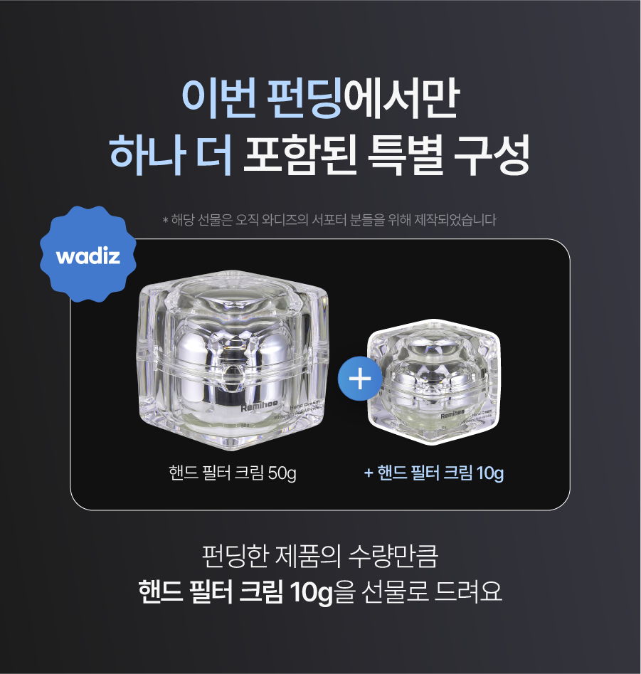 - 와디즈는 다양한 연령의 유저들이 사용하는 플랫폼이라고 생각합니다. 아직 손에 신경을 쓰고 있지 않는 30대부터 손 에이징 케어가 필요한 50대 까지 다양한 분들에게 도움을 줄 수 있는 제품이기 때문에 와디즈 채널에서 펀딩을 진행하게 되었습니다.