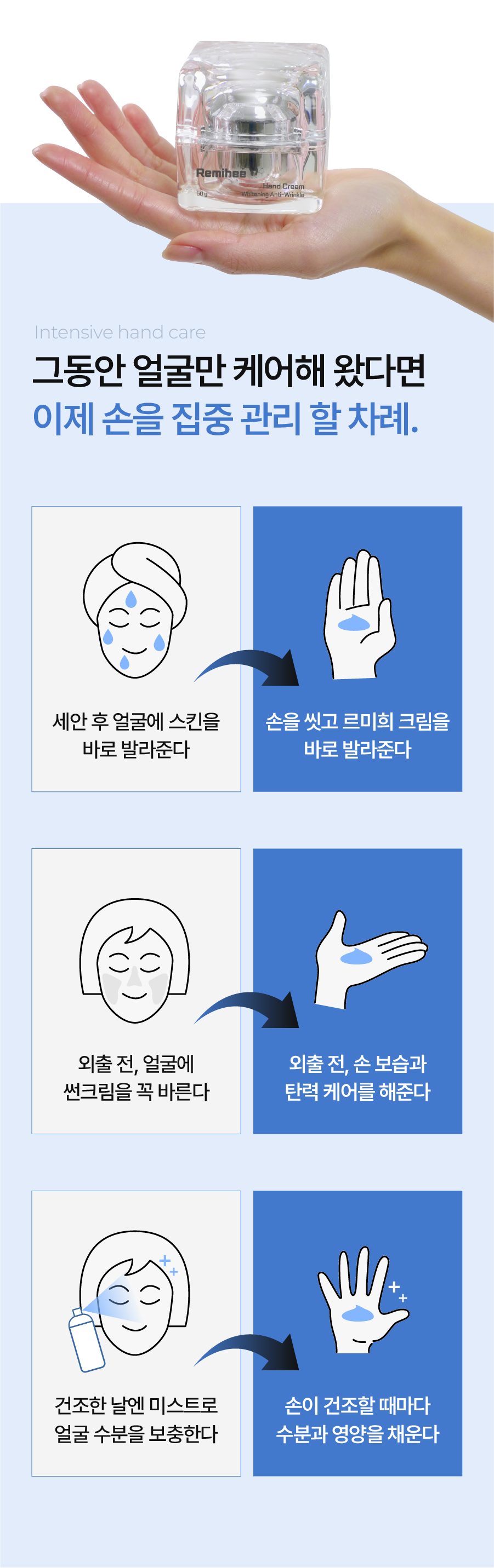 르미희는 더 효과적으로 손을 케어하고 싶은 분들을 위한 스킨케어 브랜드 입니다. 스킨케어 영역에서 얼굴은 항상 신경쓰지만, 손의 관리는 크게 하고 있지 않는 분들이 많습니다.