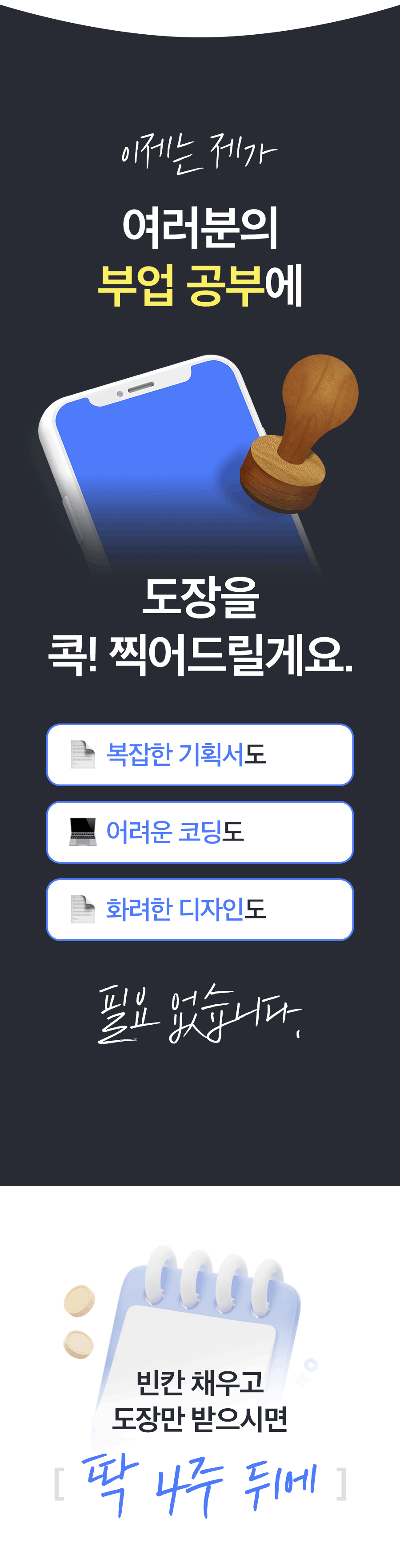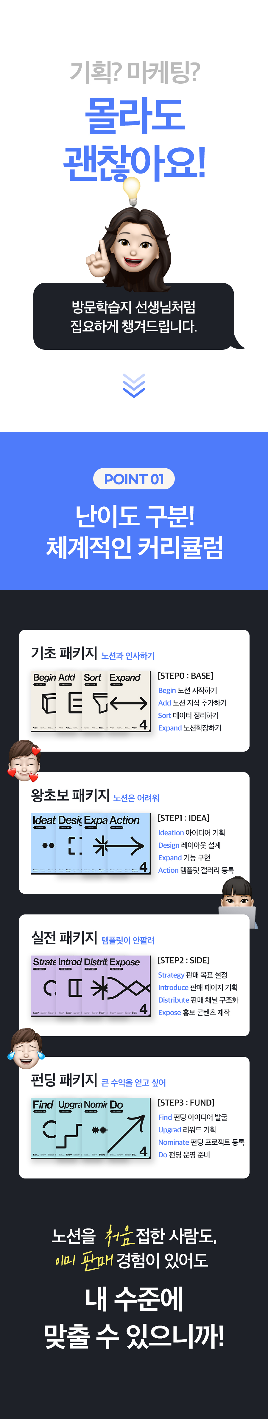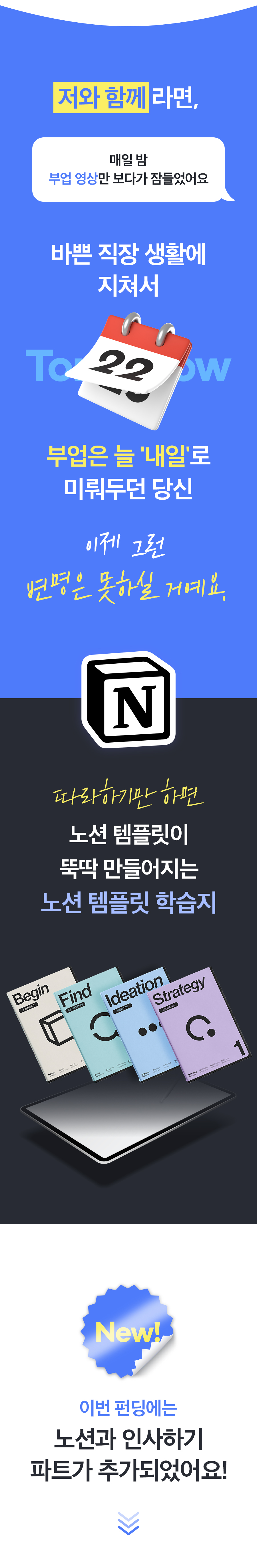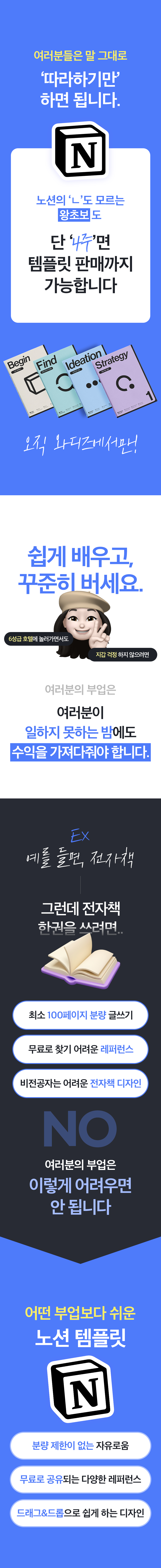 노션을 통해 많은 분들이 직장 외 부수입을 창출할 수 있는 기회를 제공하고자 노션 부업 학습지 프로젝트를 시작하게 되었어요. 고민 상담을 통해 자주 듣는 이야기들이 '어디서부터 시작해야 할지 모르겠어요' '템플릿 기획이 어렵습니다' '펀딩은 엄두가 안 나요' 같은 이야기였습니다.
