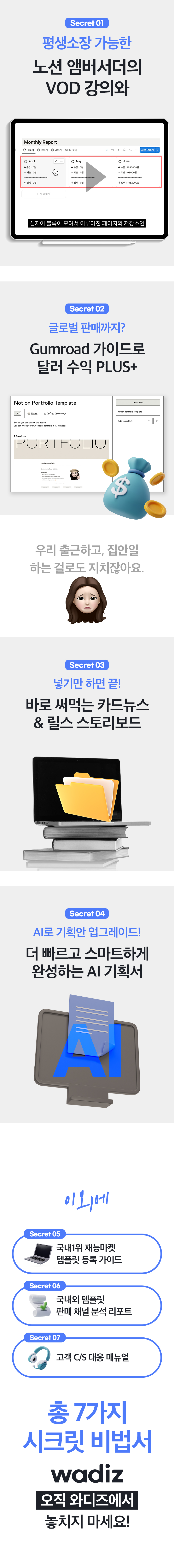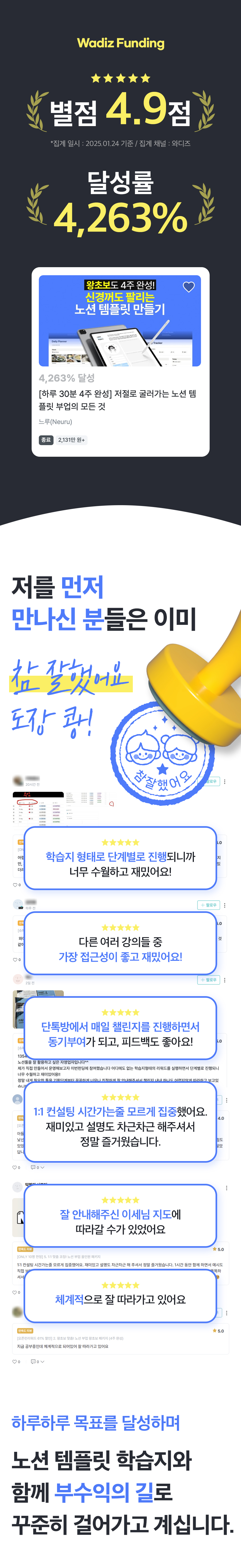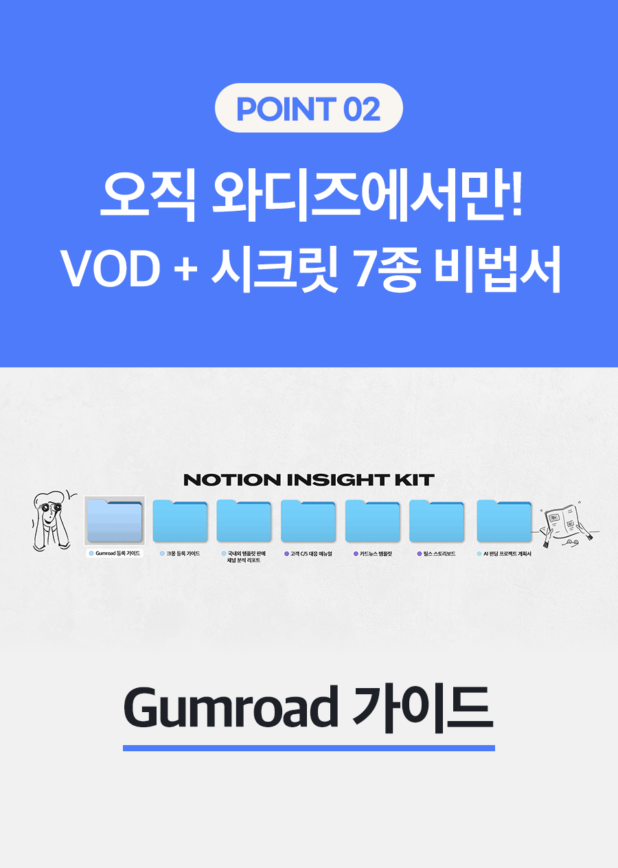 와디즈는 N잡, 부업, 사이드잡 등 일잘러들에게 매력적인 도전을 제공합니다. 와디즈를 통해 노션을 몰라도 쉽게 시작할 수 있는 노션 부업 학습지를 더 많은 분들에게 제공하고 싶습니다.