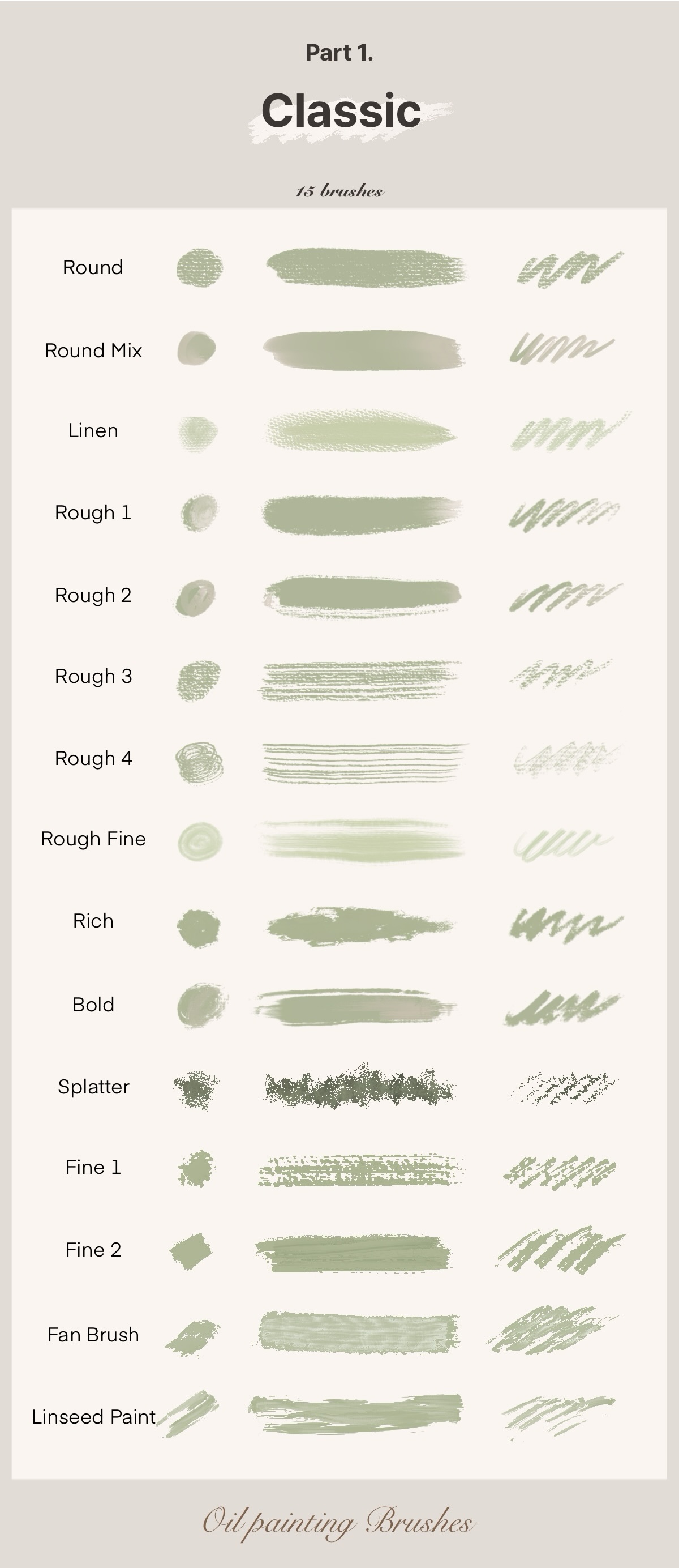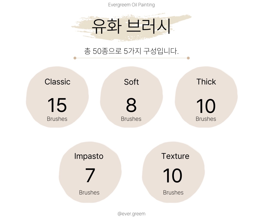 유화의 입체적이고 꾸덕한 질감과 페인트의 결을 그대로 표현한 스탬프 형식의 브러시 7종의 구성입니다.