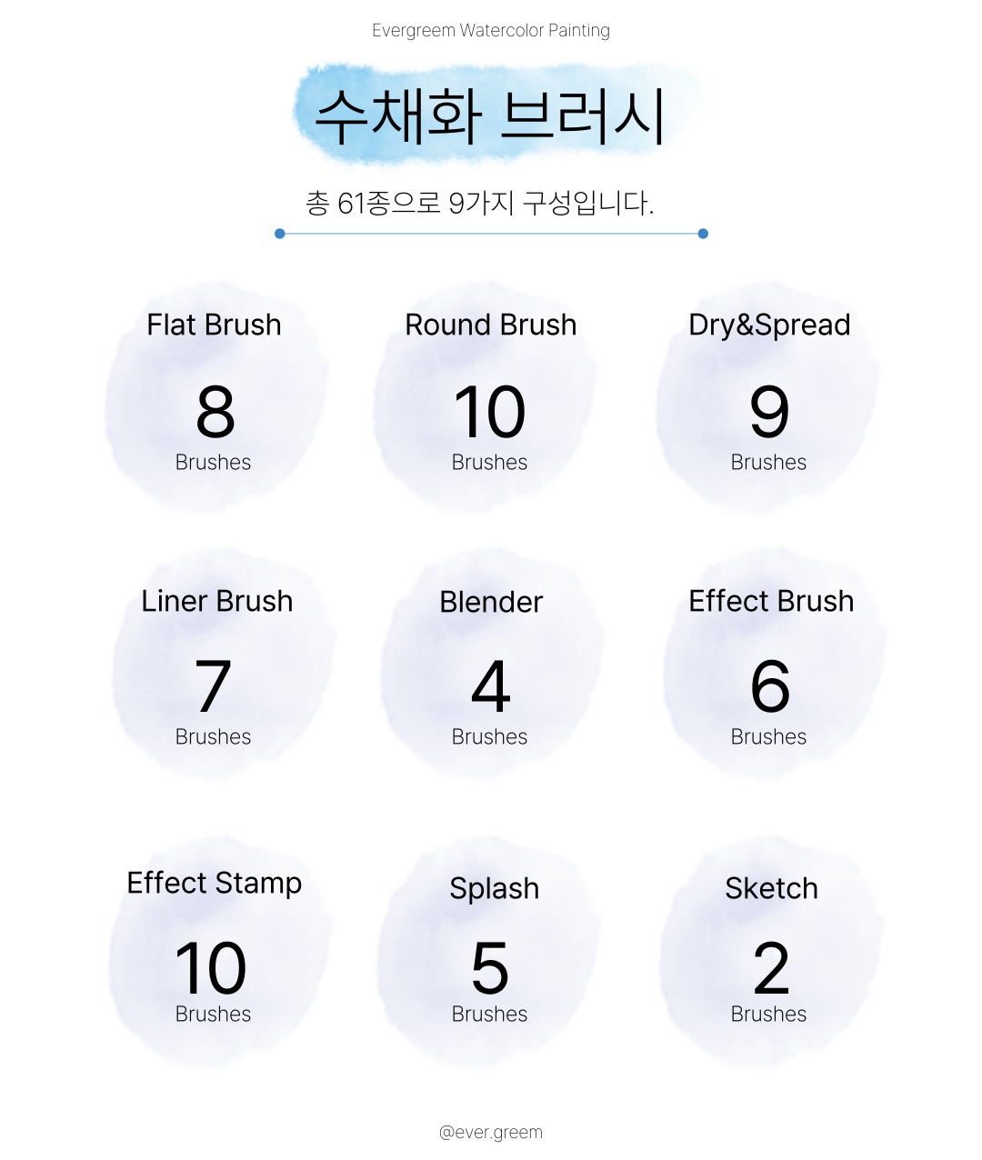 수채화의 다양한 효과를 모두 담은 스탬프 형식의 브러시입니다.
