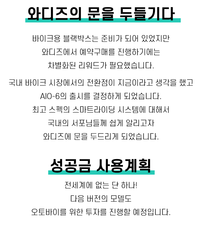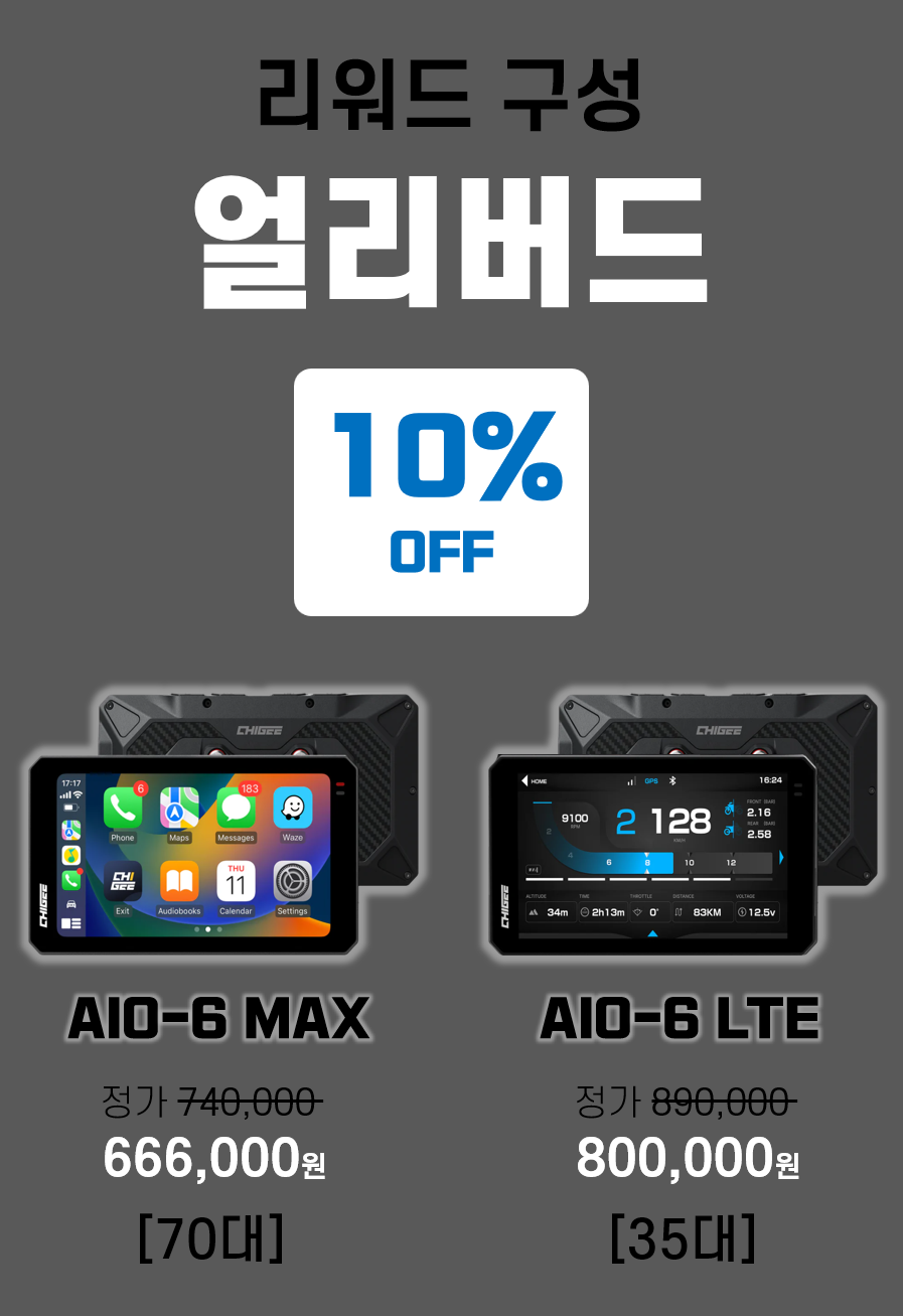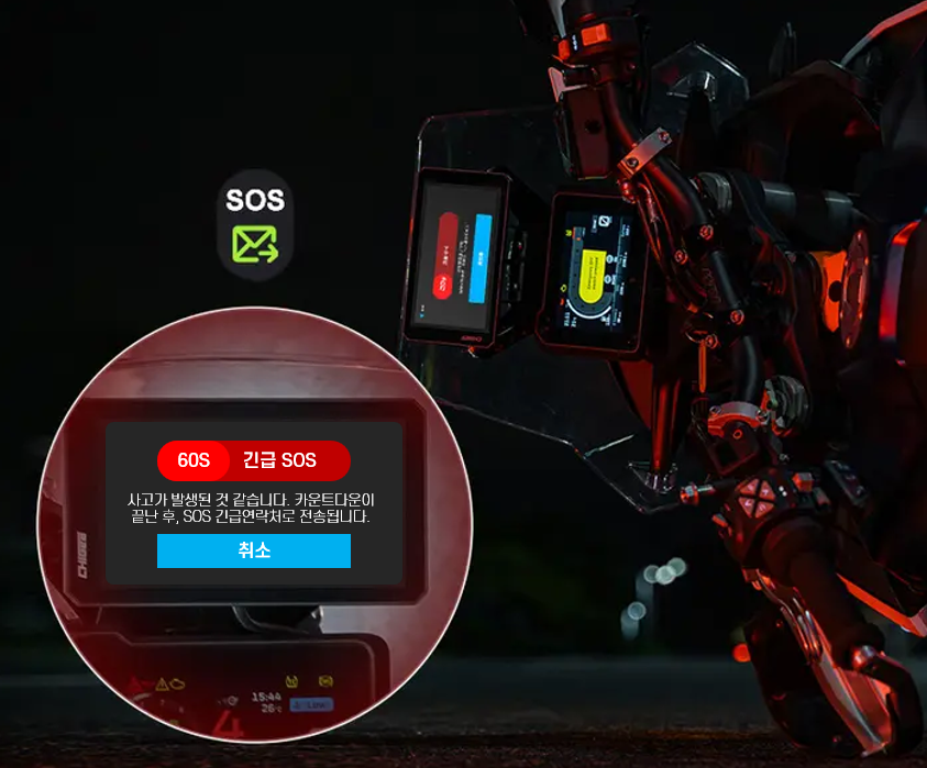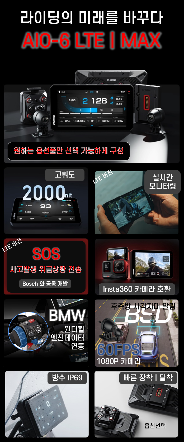 1. 🏍️ 스마트 라이딩 디바이스 AIO-6 시리즈 - 고휘도 디스플레이와 실시간 모니터링 기능 탑재 2. 🛡️ 안전 강화 SOS 위급상황 전송 - 사고 시 60초 카운트다운 후 자동 위치 전송 3. 🎁 맞춤형 옵션과 사전예약 혜택 - 원하는 기능 선택 가능, LTE 버전 사전예약 진행