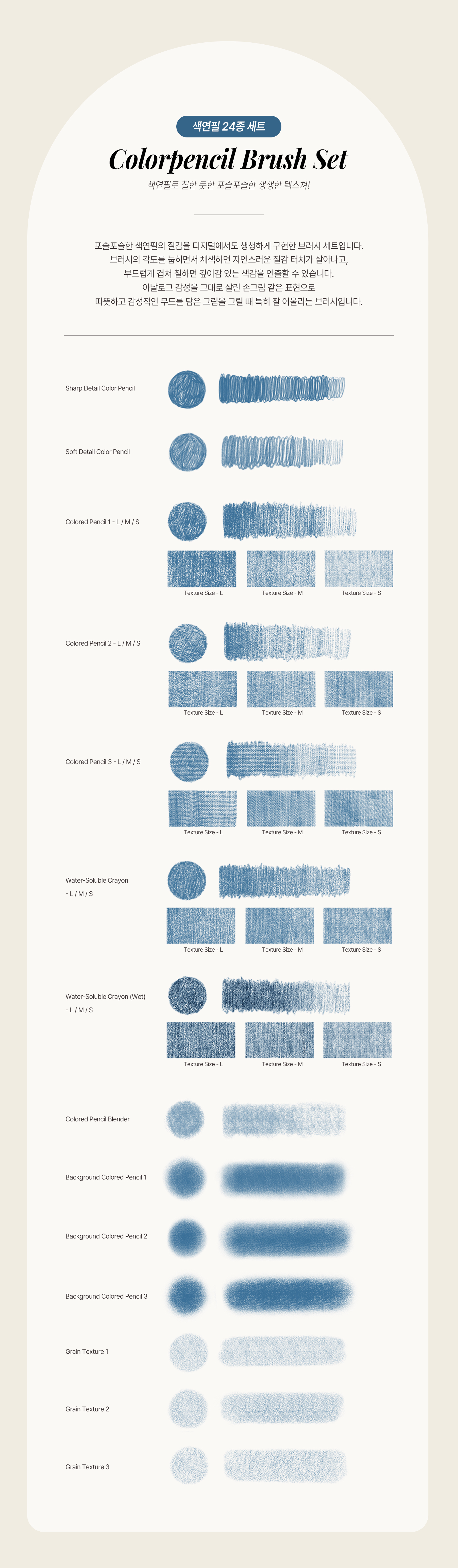 색연필 특유의 따뜻하고 질감 있는 표현을 살린 브러시 24종입니다.