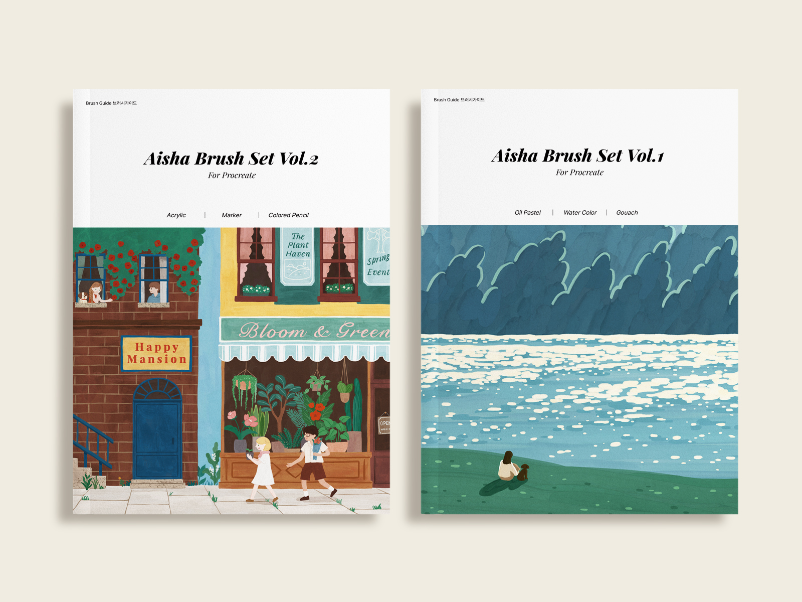 Aisha Brush Set의 모든 브러시는 프로크리에이트(Procreate)앱 5.3.15버전으로 제작 되었습니다. 5.3.15버전 이하를 사용하시는 분들은 업데이트 후 사용을 부탁드립니다.