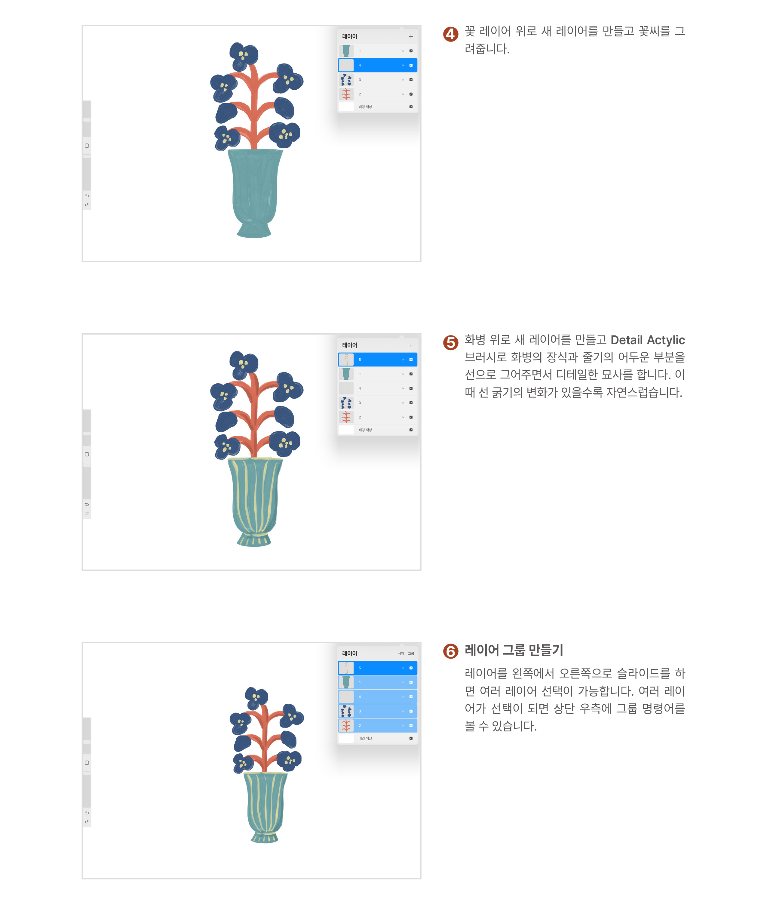 - 아이패드 기종 및 업데이트 버전에 따라서 브러시의 질감의 차이가 있을 수 있습니다.