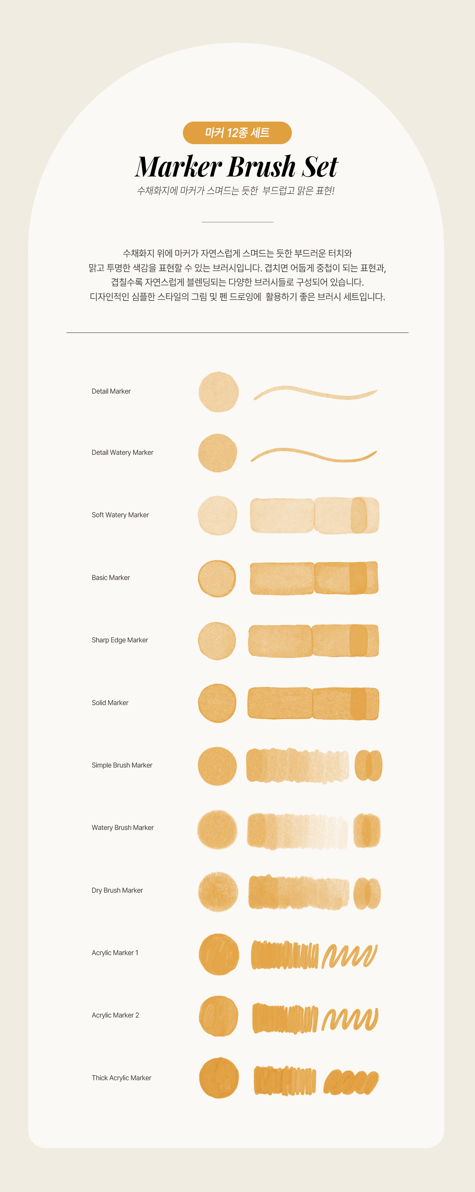 투명하고 맑은 색감이 특징인 마커 느낌을 살린 브러시 12종입니다.