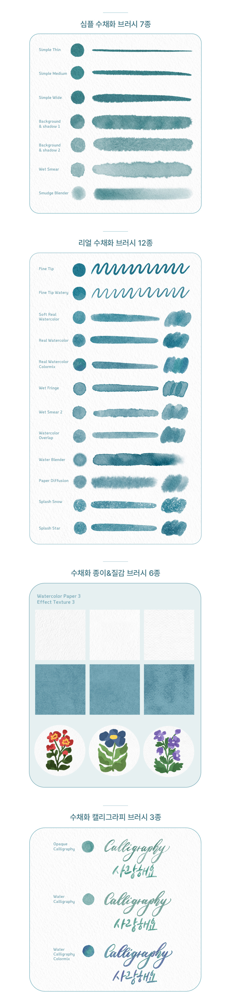 심플 수채화 7종, 리얼 수채화 12종, 수채화 질감 브러시 6종, 캘리그라피 브러시 3종