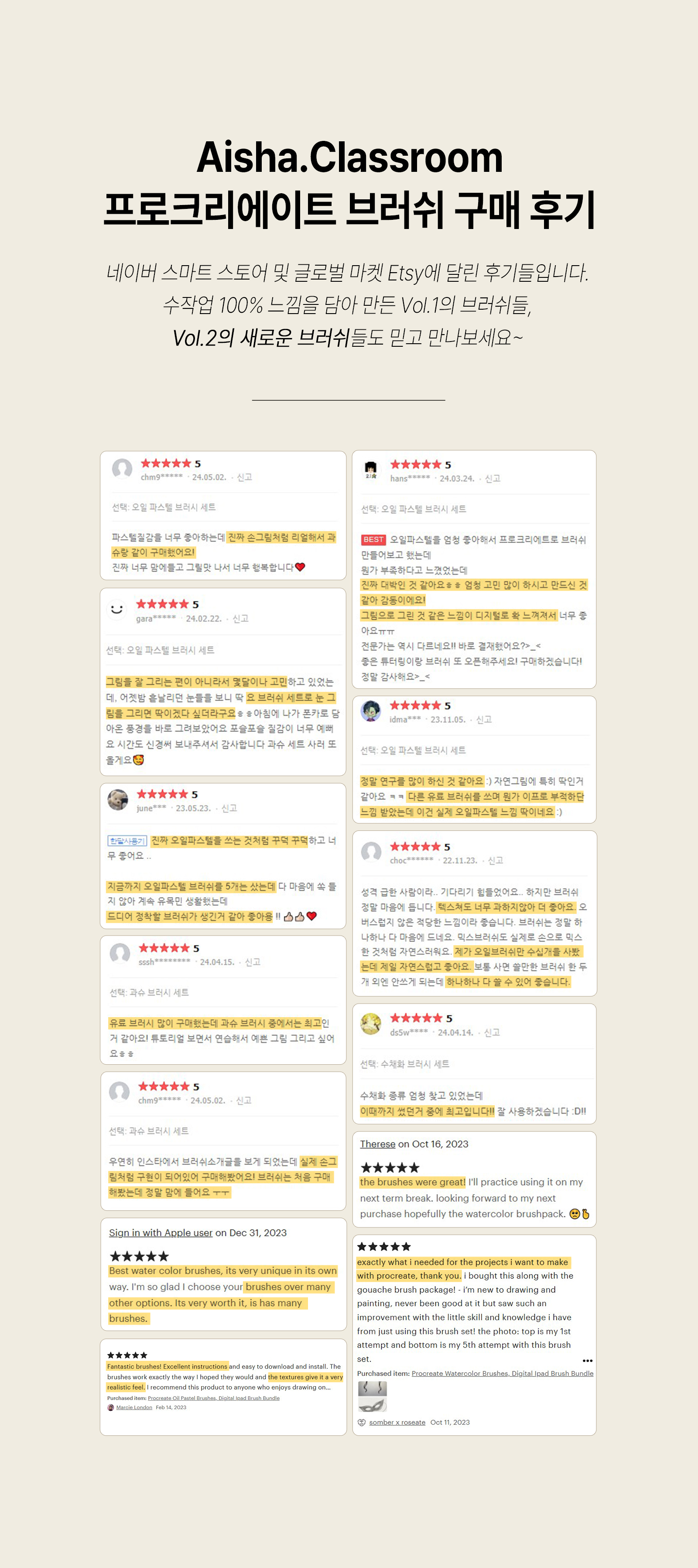- 브러시 세트 및 가이드북, 미니 클래스 영상은 구글 드라이브 다운로드 링크 형태로 제공됩니다.