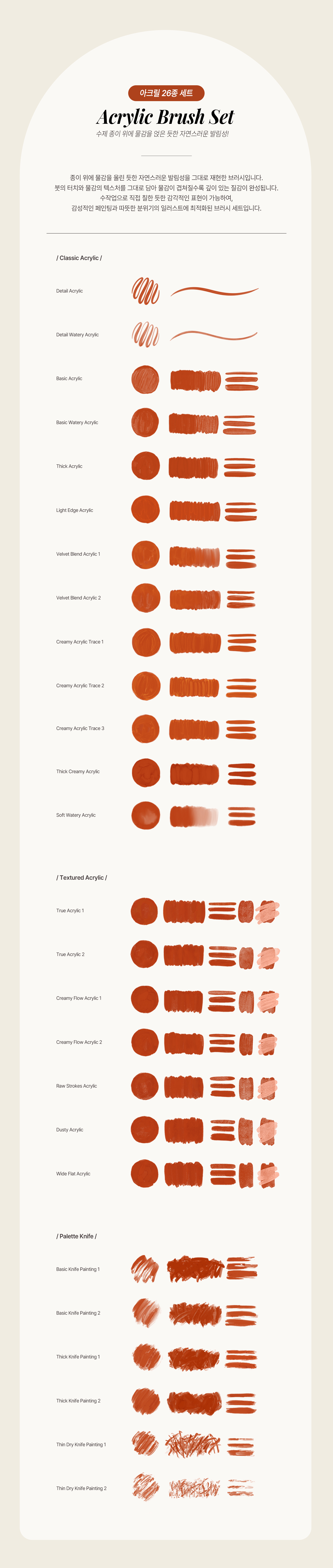 수작업 아크릴의 질감과 표현 방식을 그대로 담은 브러시 26종입니다.