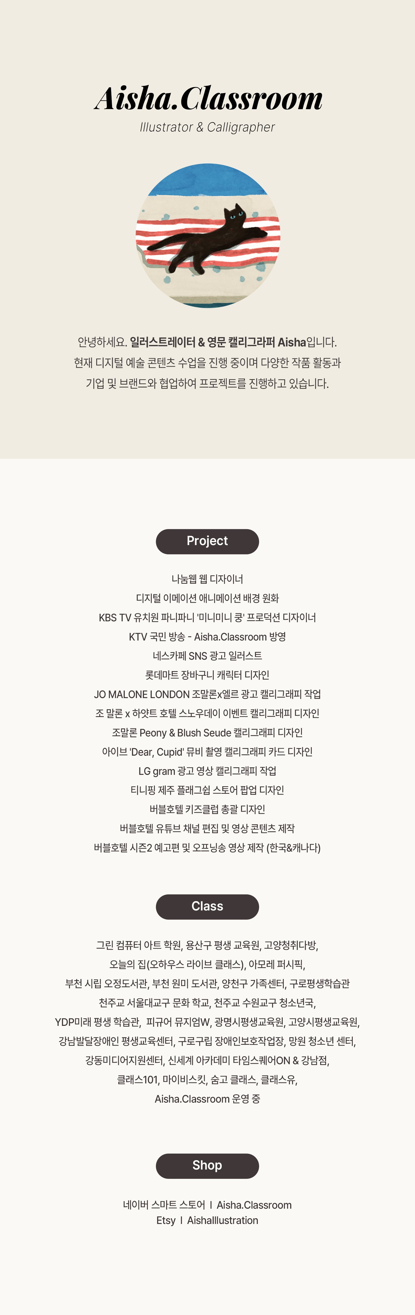 현재 Aisha.Classroom을 운영 중이며 다양한 예술 콘텐츠 교육을 진행하고 있습니다.