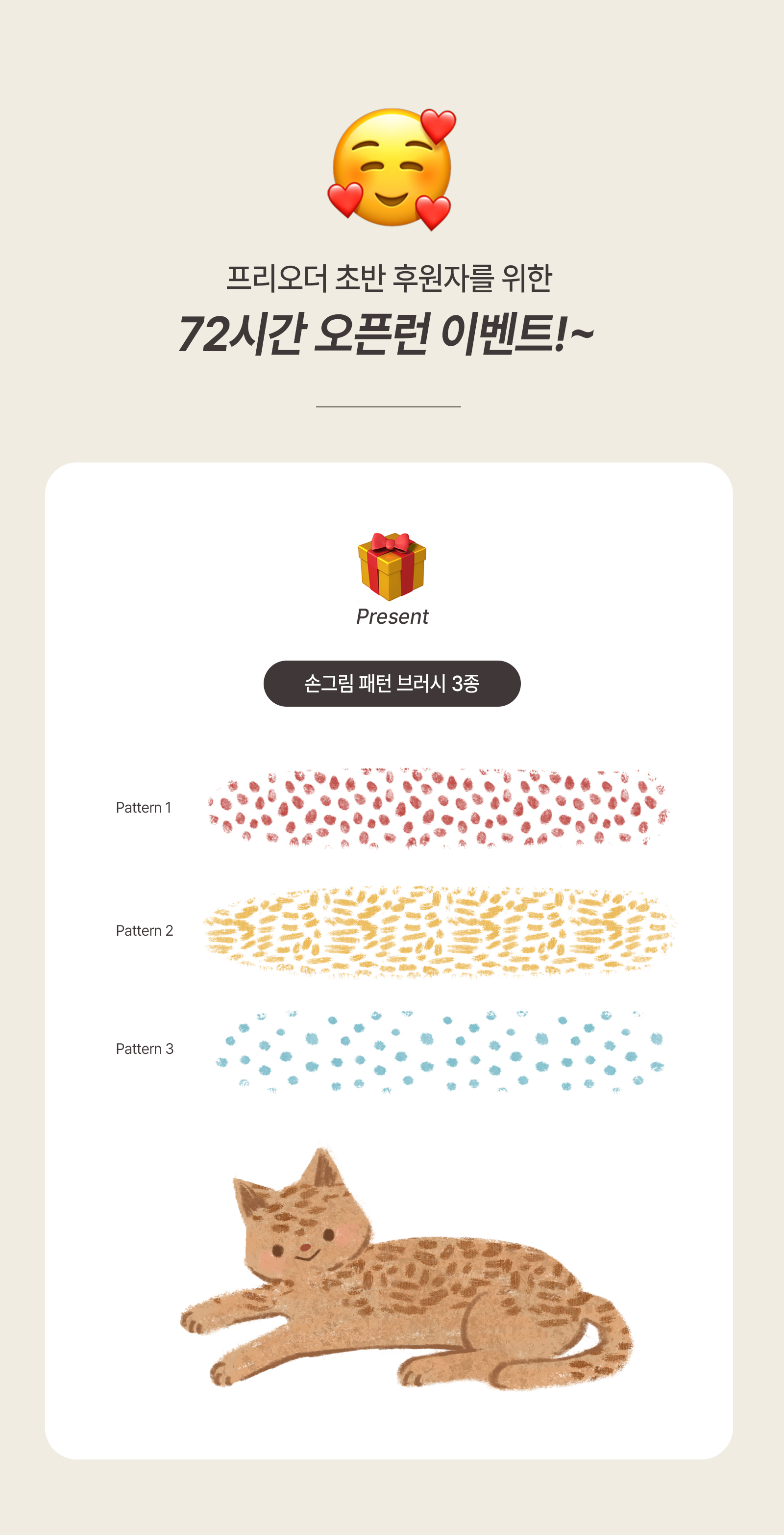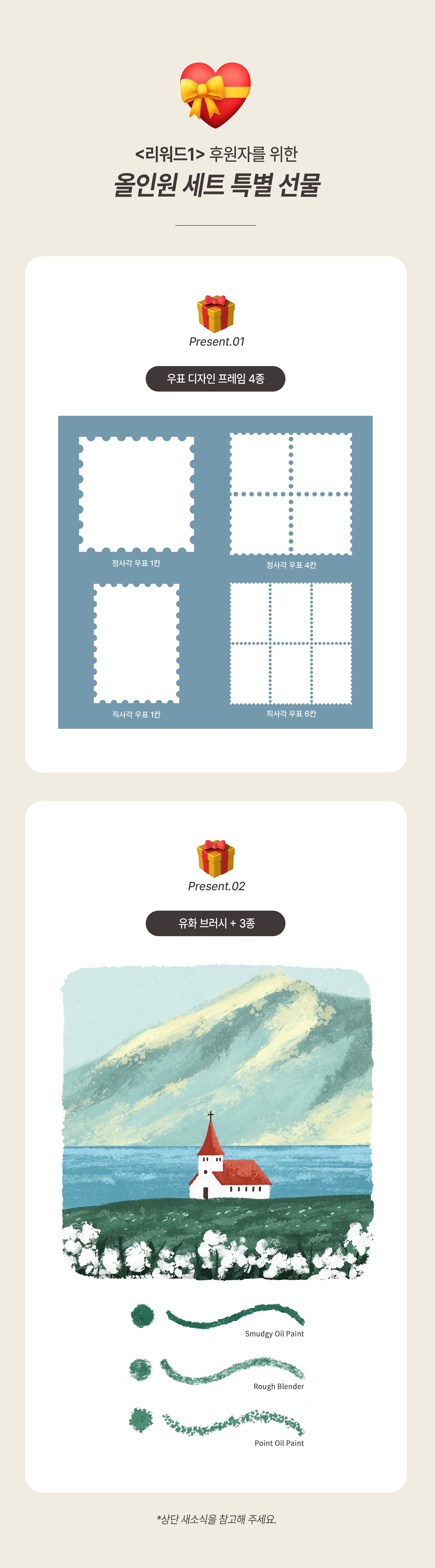 이번 와디즈 프리오더를 통해 더욱 많은 분들이 프로크리에이트에서 손그림을 그리듯 자유롭고 힐링이 되는 작업을 경험하시길 바랍니다. 완성도 높은 브러시와 함께 추가 구성으로 미니 클래스 영상까지 준비했으니, 감성 가득한 작품을 완성해 보시길 바랍니다.