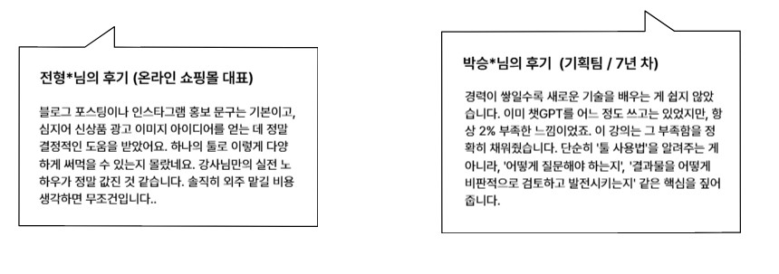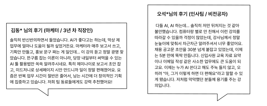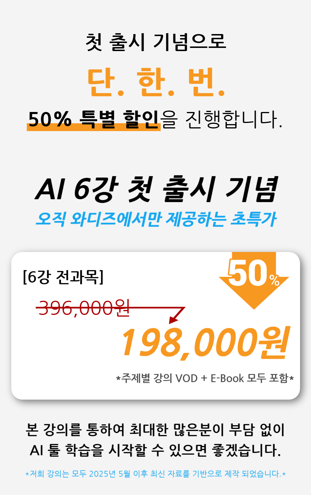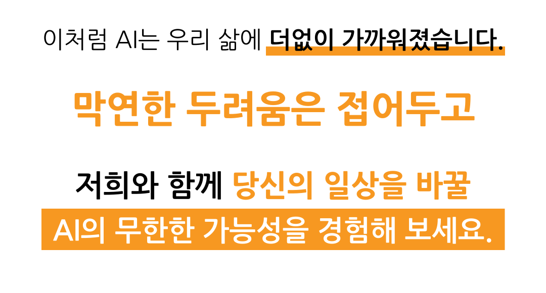 꼭 저희 강의가 아니어도 좋습니다. 다만, 곧 AI 없이는 대부분의 업무를 못 하는 날이 찾아올 것입니다. 당신의 미래를 위해, 우선 시작하셔야 합니다.