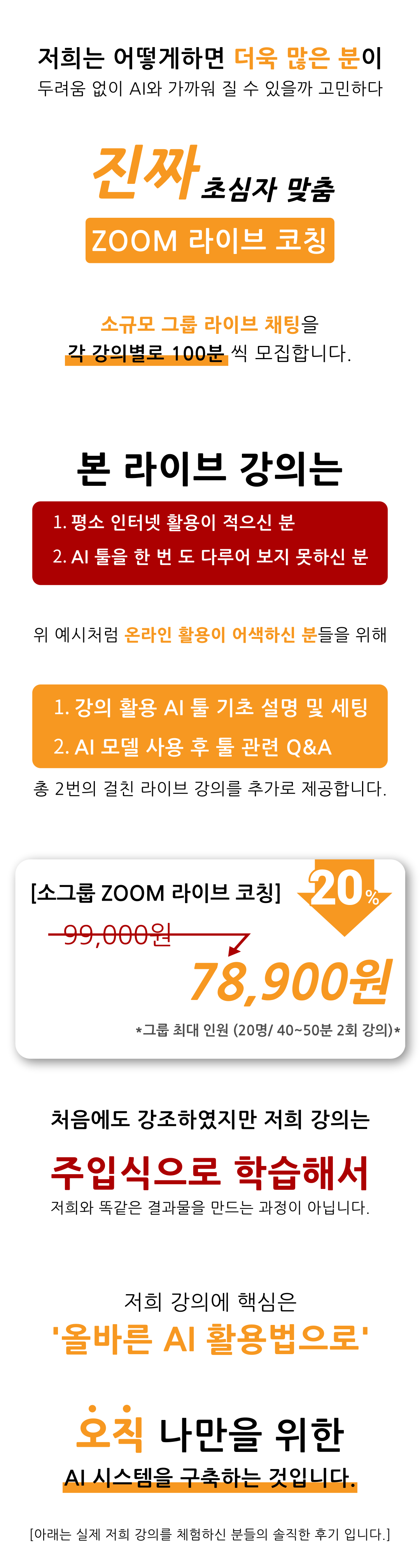 AI가 처음이라, 혹은 인터넷 사용이 익숙하지 않아 강의를 따라가는 첫걸음조차 망설여지시나요? 그런 분들만을 위해, 저희가 직접 손을 잡아드리는 소그룹 라이브 코칭을 준비했습니다. 본 VOD 강의와 E-Book만으로도 충분하지만, 시작의 두려움을 자신감으로 바꿔드리기 위한 특별 프로그램입니다.