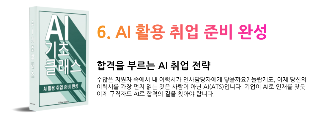 지금 이 순간에도 현직 면접관들의 AI 이해도는 각기 다릅니다. 이런 상황에서 당신이 AI를 활용한 맞춤형 포트폴리오와 이력서를 제출한다면 어떻게 될까요? 당신은 단순히 해당 직무의 후보자가 아니라, ‘AI 시대를 이해하고 이끌어갈 잠재력이 높은 인재’라는 사실을 스스로 증명하게 됩니다. 다른 지원자와는 비교할 수 없는 높은 가치를 인정받게 되는 것입니다. 이제 당신이 면접을 ‘기다리는’ 것이 아니라, 면접 제안을 ‘받게’ 될 차례입니다.