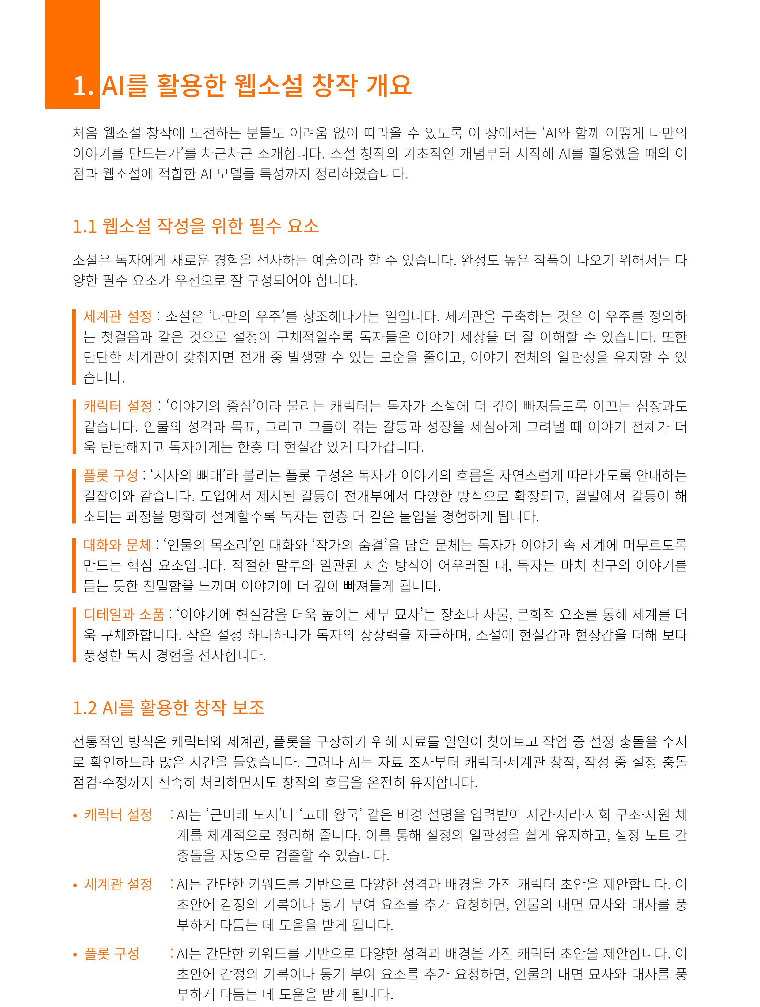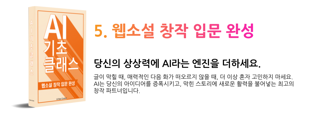 배포 및 수익화: 완성된 소설을 어떤 플랫폼(카카오, 네이버, 문피아 등)에 연재해야 유리할지, 독자의 눈길을 사로잡는 시놉시스와 작품 소개는 어떻게 쓰는지, 심지어 AI로 웹소설 표지를 만드는 방법까지. 창작에서 수익화로 이어지는 전 과정을 안내합니다.