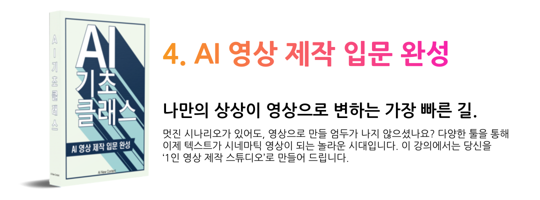 AI 영상 제작은 아직 빠르게 발전하고 있는 분야이기에, 지금이 바로 기회입니다. 기술이 완전히 성숙하기 전인 지금, 먼저 기본 개념과 흐름을 이해하고 경험을 쌓는다면, 앞으로 더욱 강력해질 AI 영상 시대를 선도할 수 있습니다. 이 입문 과정을 통해 여러분은 ‘필요한 광고 영상을 직접 만드는 수준’까지 도달하며, 무궁무진한 영상 콘텐츠의 세계로 나아갈 튼튼한 토대를 마련하게 될 것입니다.