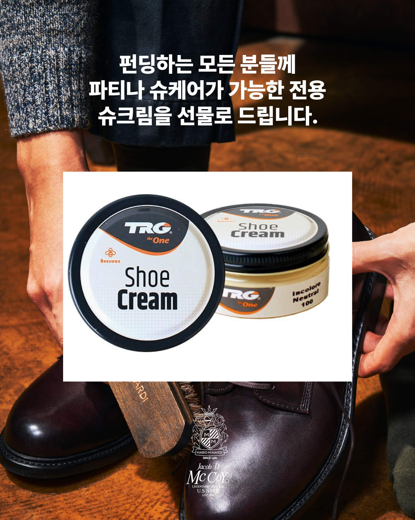 와디즈를 통해 마리오 미나르디를 널리 알리고 싶습니다. 많은 서포터님들이 굿이어웰트 제법을 기반으로 하고, 파티나 기법을 통해 고급스러운 외관을 연출하는 MAIRO MINARDI와 함께 즐거운 경험하셨으면 하는 바램입니다. 서포터님들의 후기를 통해 검증된 착화감은 덤입니다. 합리적인 가격과 감각적인 스타일 그리고 착화감까지 검증받은 MARIO MINARDI를 신고 행복한 하루를 시작하셨으면 좋겠습니다. 모금된 펀딩 금액은 리워드 제작과 다음 프로젝트의 신제품 출시 개발 비용으로 사용됩니다.