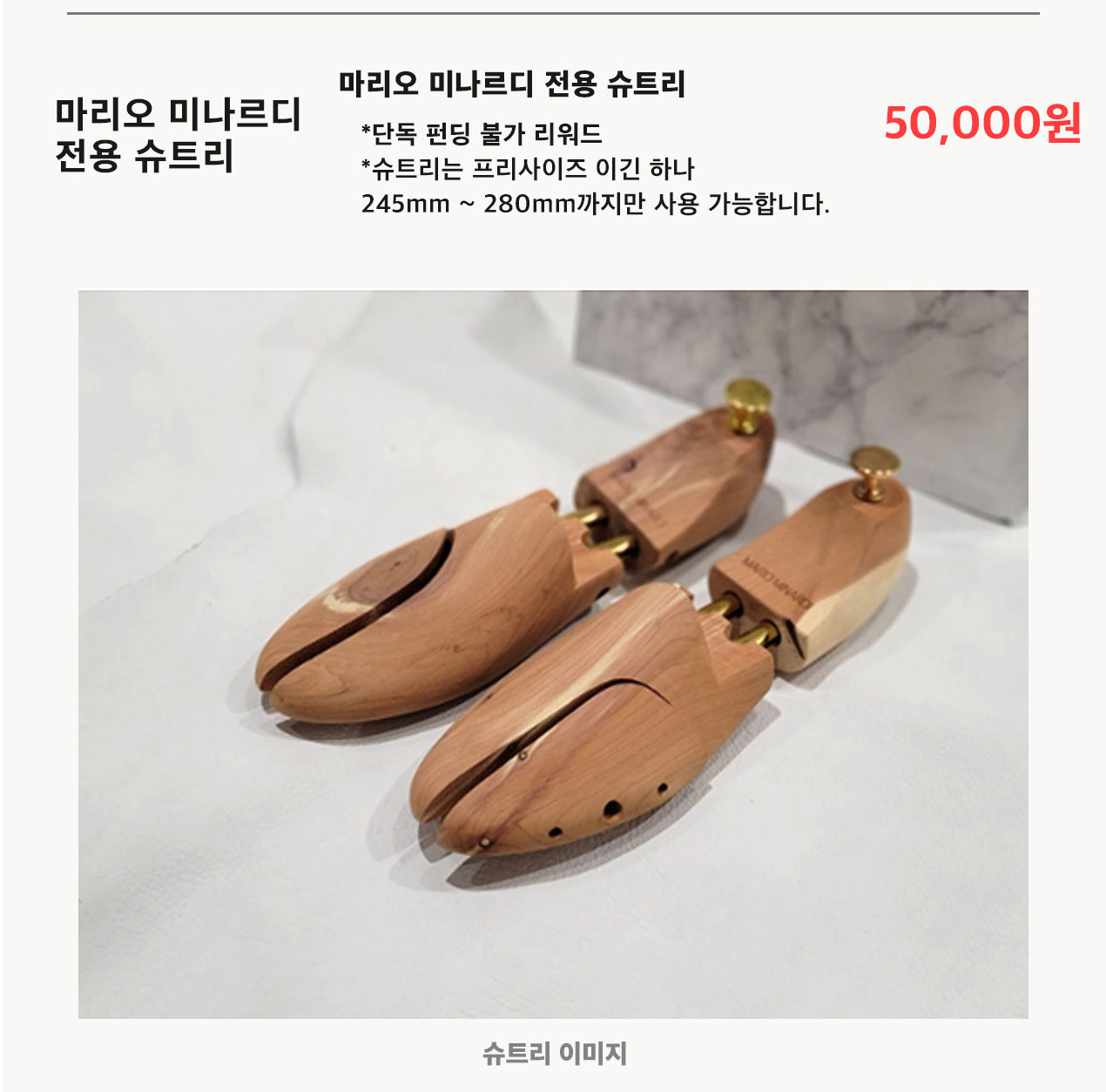 285~300 사이즈는 별도 요청에 의해 진행될 수 있는 리워드입니다. 285~300 리워드를 제작 요청하시는 경우 단순 변심에 의한 취소가 불가능합니다. 정확한 사이즈를 모르시는 경우 메이커에게 문의하기 또는 카카오톡 채널(클릭)로 요청시 사이즈 확인 가능한 피팅 샘플을 무상으로 보내드리겠습니다. 마리오미나르디 리워드 예약 구매가 처음이시고 사이즈 확인이 필요하시다면, 마리오미나르디 사이즈 확인이 가능한 피팅 샘플을 무상으로 보내드리고 있습니다. 부담없이 카카오톡 채널 마리오미나르디로 연락 부탁드려요. 마리오미나르디에 맞는 사이즈 확인해드립니다 (해외 서포터의 경우, 피팅 샘플 무상 택배발송 서비스가 지원되지 않습니다)