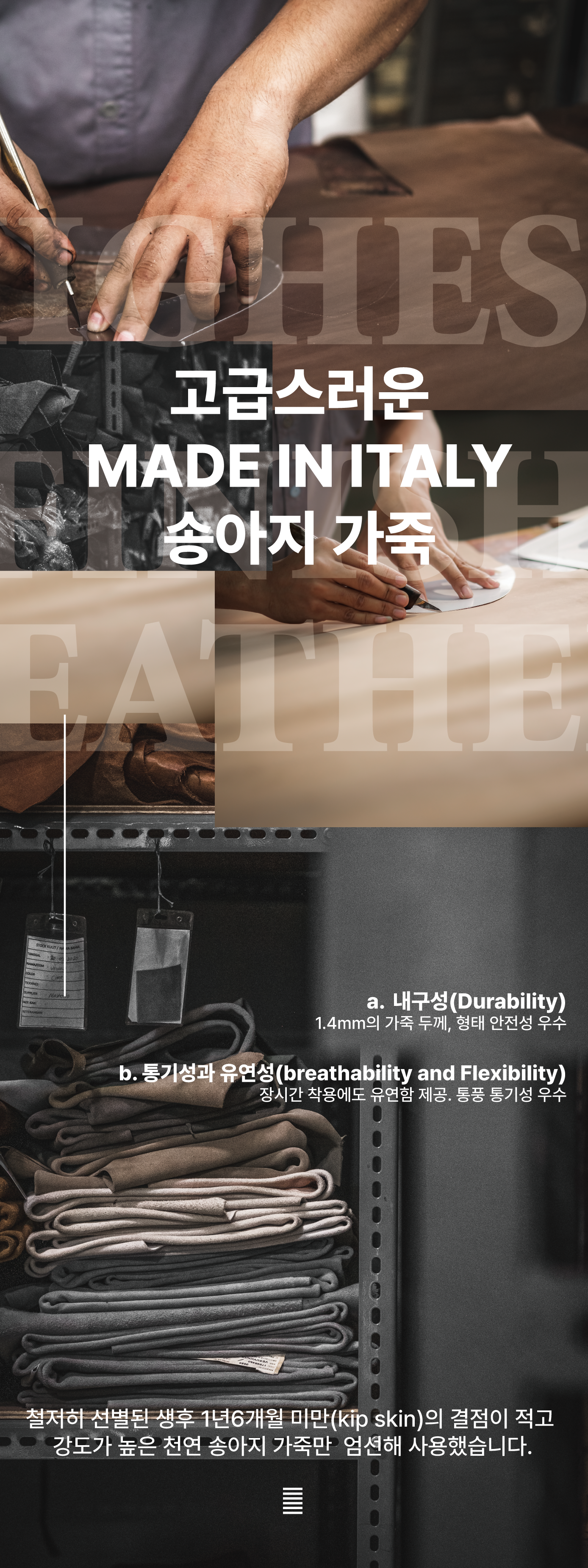 이태리 토스카나 지방에서 생산된 식물성 태닝 송아지가죽은 모공이 좁고 상처가 작아 고급스럽고 균일한 결을 자랑합니다. 담백함이 느껴지는 표면은 염료를 잘 품어줘, 뛰어난 발색력을 갖추게 합니다. 적당한 광택감 그리고 소프트한 터치감 등 킵스킨의 장점은 너무나도 많습니다.