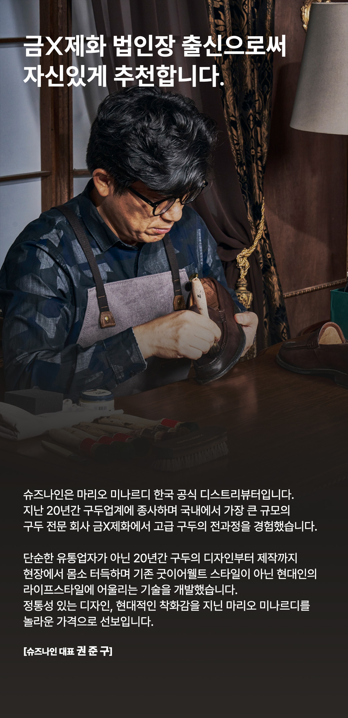 1982년 이탈리아에서 시작된 MARIO MINARDI는 파티나 사상을 필두로 모던함이 가미된 클래식 슈즈를 만드는 브랜드 입니다. 여러번의 펀딩을 통해 서포터님들을 만나뵌지도 5년이라는 시간이 지났습니다. 1대 창업주에 이어 현재 2대 대표의 지휘 아래 MARIO MINARDI는 최고의 재료를 탐구하고 더 현대적인 모델을 소개하며 전통적인 신발 제조 기술과 창의성/혁신을 결합하려고 노력하고 있습니다.