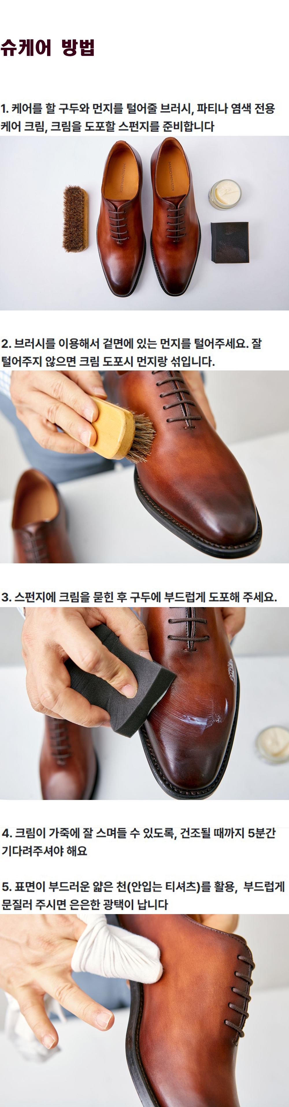 파티나 색감이 고급스럽지만, 그만큼 이쁜 컬러를 오래 즐기시려면 가끔 슈크림으로 케어해주시는 것을 추천드립니다. 물광 또는 불광은 절대 금지입니다. 군대 전투화처럼 가죽의 표면 상태가 좋지 않아 전체를 갈아내고 강하게 코팅을 입힌 저가 가죽의 경우에만 물광이나 불광이 어울립니다. 파티나 구두는 무색 슈크림으로 가볍게 닦아주시는 것을 추천 드립니다