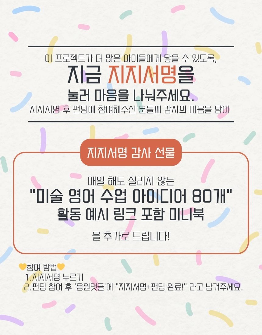 저는 14년 동안 아이들을 가르쳐온 영어·미술 교사로서, 직접 개발하고 실전에서 효과를 검증한 ‘영어 게임화 교육’ 자료와 노하우를 전자책 형태로 펀딩하고자 했으며, 첫 공개 플랫폼을 와디즈로 선택했습니다.