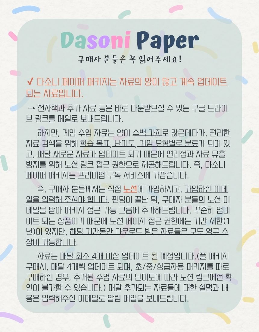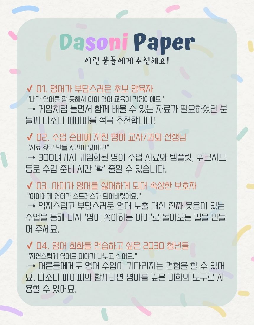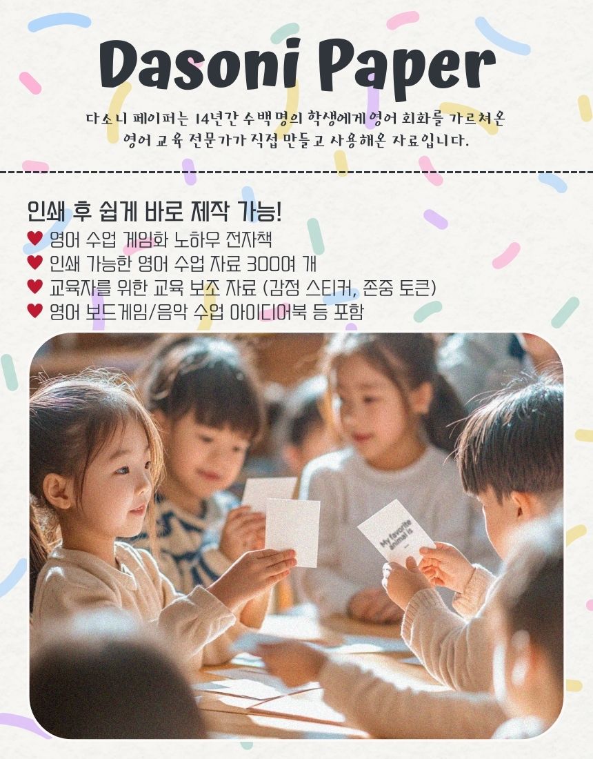 모든 아이들이 영어를 즐겁고 행복하게 배웠으면 하는 마음 하나로 다소니 페이퍼를 만들었습니다.