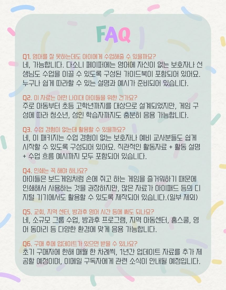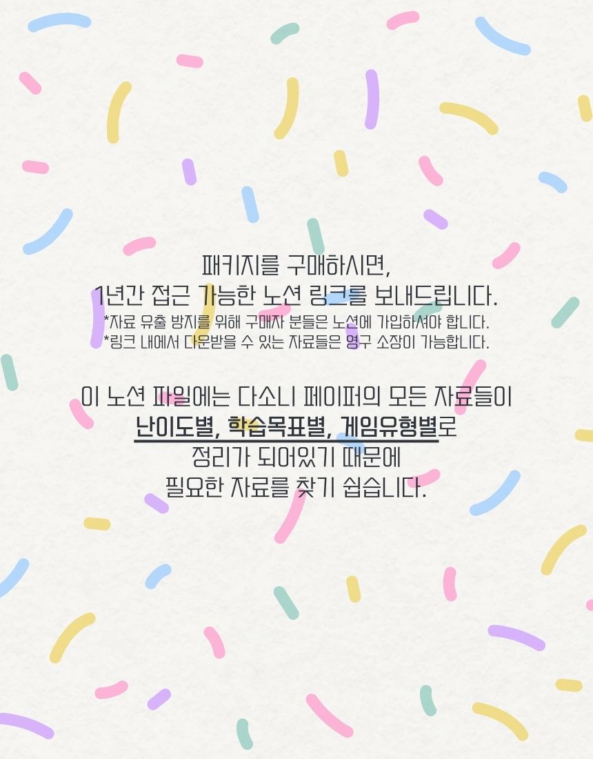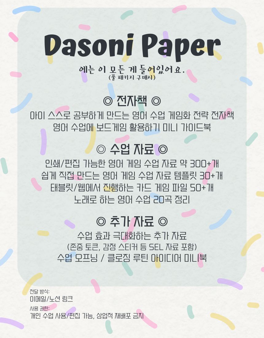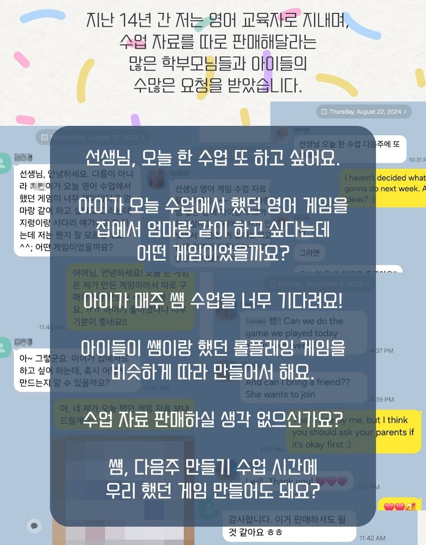 이 패키지 하나에 14년간 영어를 가르치며 사용했던 모든 영어 게임 자료들과 아이들이 즐거워하는 영어 게임 수업 노하우들을 전부 집어넣었습니다.