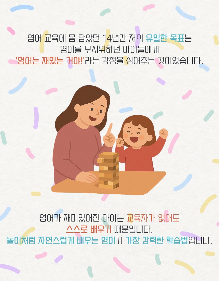 어릴 때부터 영어를 자연스럽고 재미있게 배웠던 저는 아이들에게도 영어를 그렇게 가르치고 싶었고,