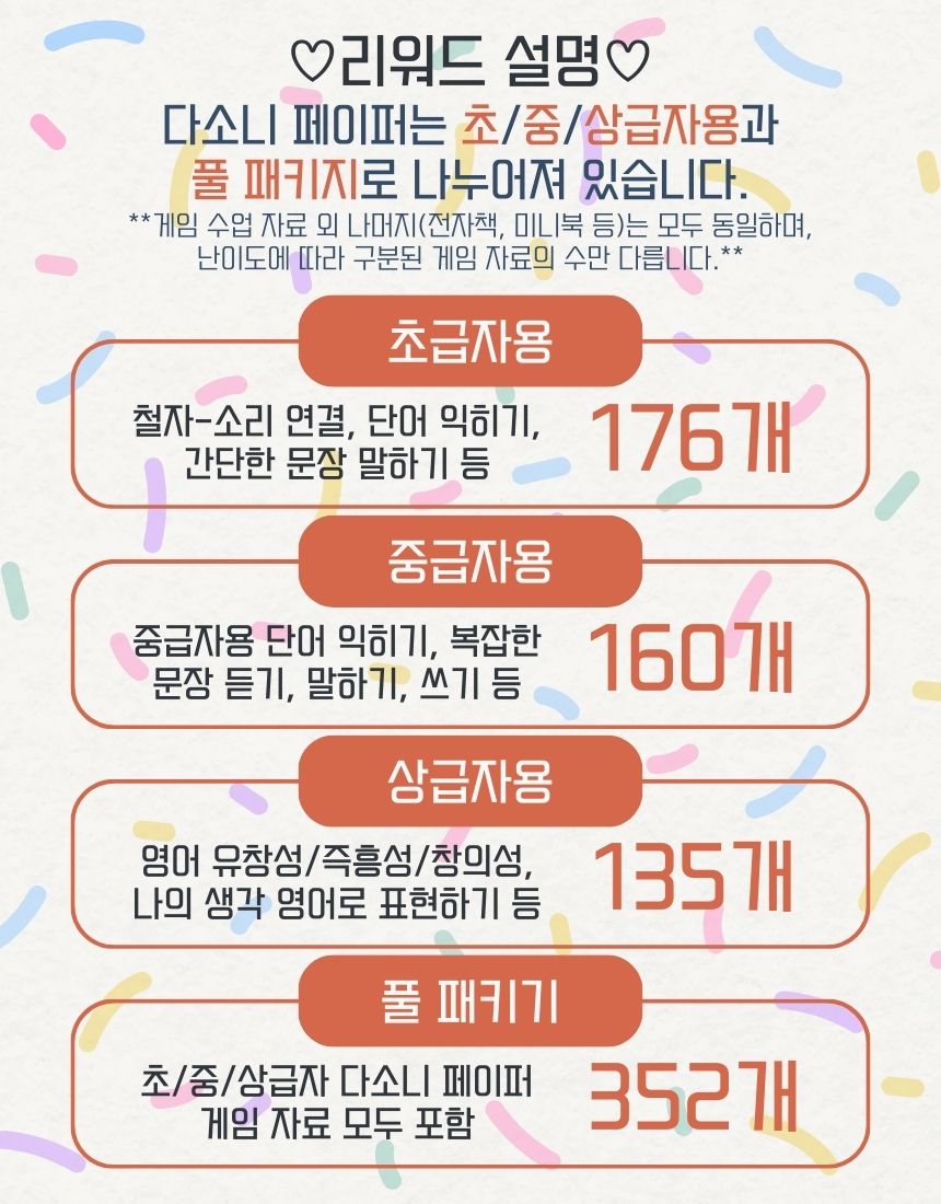 다소니 페이퍼는 학습 목표와 학습자의 영어 수준(난이도), 게임 유형별로 정리가 되어있습니다.