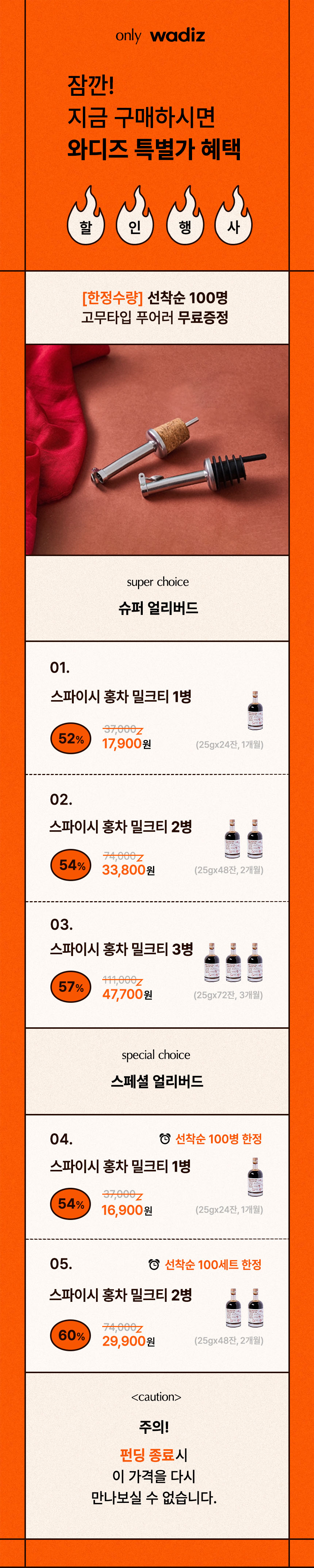 1. 🍵 8종 스파이스 홍차 밀크티 - 8가지 허브와 스파이스가 어우러진 건강한 밀크티 2. 🔥 신진대사 활성화 음료 - 기초대사량을 높여 칼로리 소모와 에너지 증진 도움 3. 🎁 선착순 할인 및 푸어러 증정 - 최대 60% 할인과 고무타입 푸어러 무료 제공