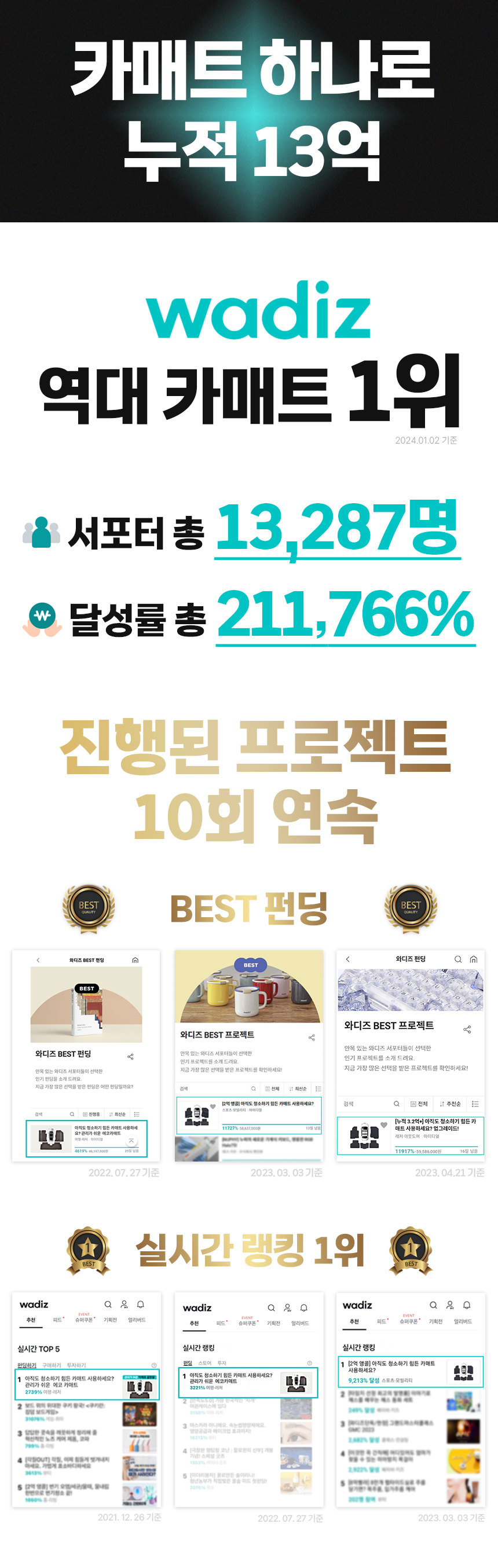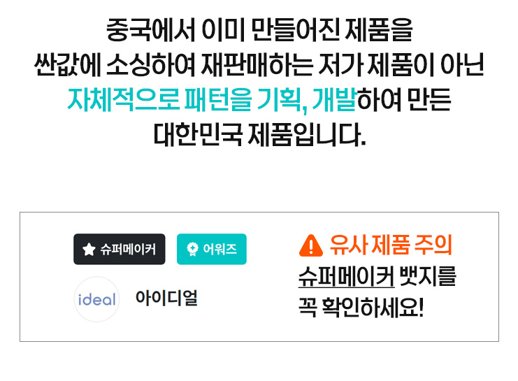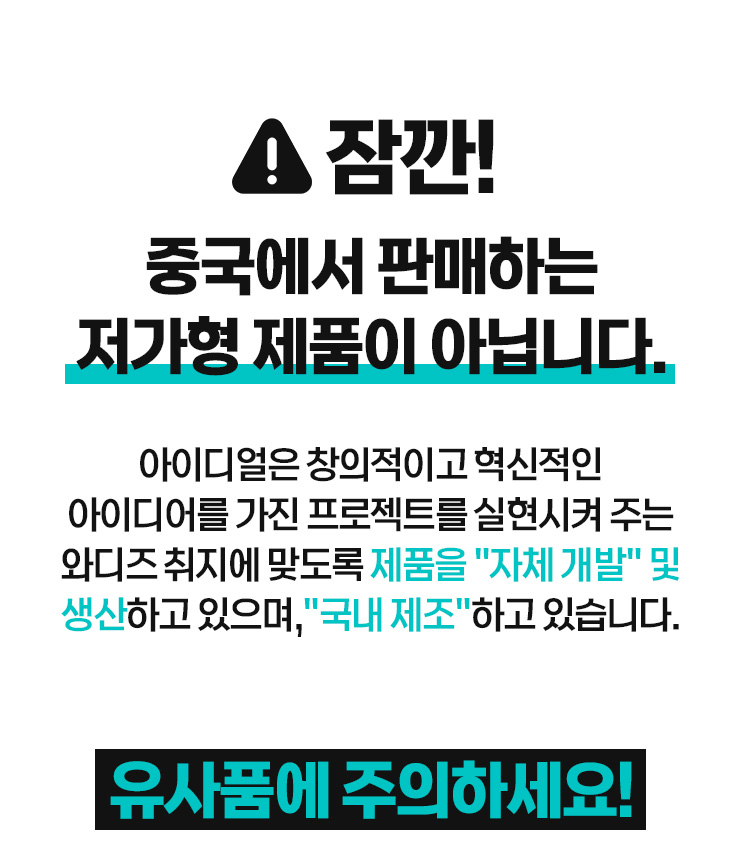 안녕하세요. IDEAL입니다. 협업을 통해 진행하고 있는 이번 프로젝트를 발견해주신 서포터님들께 진심으로 감사드립니다. "일상의 새로운 발견" 이라는 서비스 정책의 와디즈가 주는 핵심 가치는 "참신한 아이디어" 라고 생각합니다. 그렇기에 저희는 저가의 중국산 완제품이나 시중에 오랫동안 판매되고 있는 기성 제품들은 펀딩/프리오더 하지 않습니다. 와디즈 플랫폼이 서포터님들께 주는 가치와 부합하는 새로운 제품을 만들기 위해 제품 개발에 항상 최선을 다하겠습니다. 다시 한번 해당 프로젝트를 발견해 주시고, 함께해 주신 서포터님들께 감사의 말씀을 전합니다. 진심으로 감사합니다.