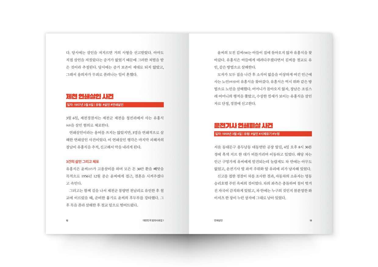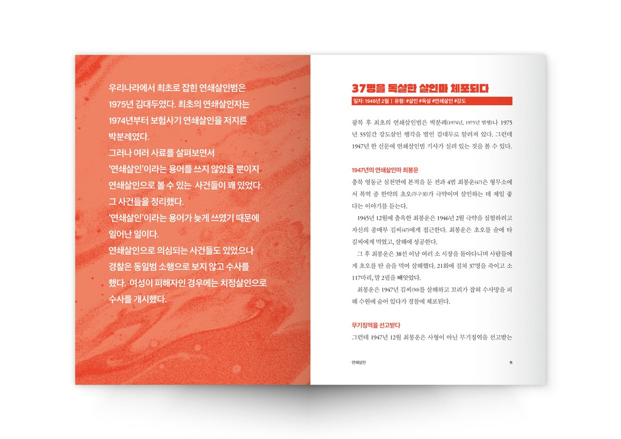 그래서 제가 할 수 있는 프로젝트를 기획했습니다. 그리고 밤낮 없이 매달린 프로젝트가 이 <대한민국 범죄사료집>입니다. 이 프로젝트를 진행하는 동안 정말이지 영혼을 가는 느낌이었습니다. 수많은 충격적인 범죄를 수집하면서 몸도 마음도 지쳐갔습니다. 그래도 예전처럼 우울하지는 않았습니다. 제가 좋아하는 일이기 때문에 더 힘내서 작업할 수 있었습니다.