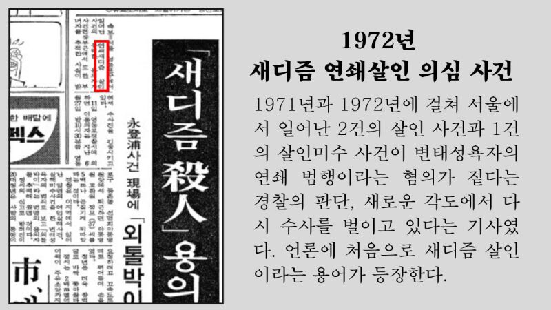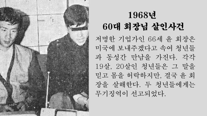 1945년부터 1980년까지의 살인 사건 중에서 언론에 크게 보도되는 종류의 사건 중 하나가 불륜이나 부적절한 관계로 인한 살인 사건입니다. 불륜 관계에서만 살인이 일어나는 게 아니었습니다. 치정살인도 자주 일어났습니다. 노인이 같은 남성인 청년들을 성적으로 이용하다가 결국 살해되는 사건, 양부모로 섬기다가 부인과 잠자리를 가지다가 남편에게 살해된 청년 사건 등 욕망은 언제나 살인의 큰 동기였습니다.