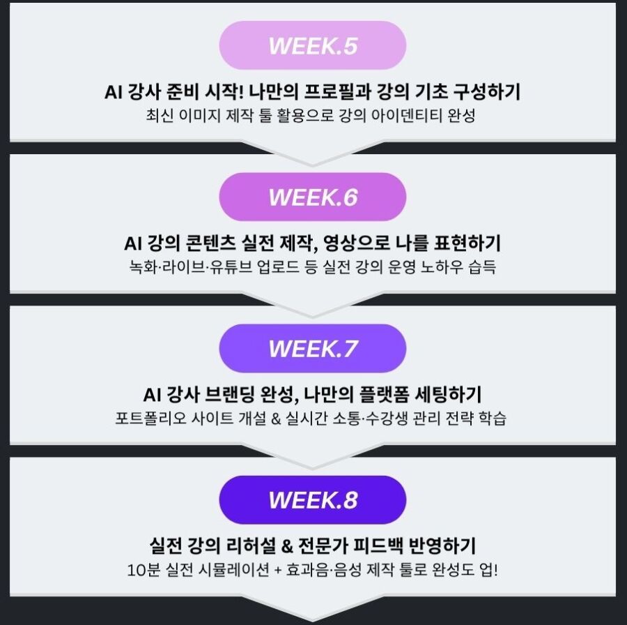 8주간의 커리큘럼은 강의와 작업에 바로 활용 가능한 핵심 내용을 중심으로 구성되어 있으며, 실무 환경에서도 쉽게 응용할 수 있도록 설계되었습니다.