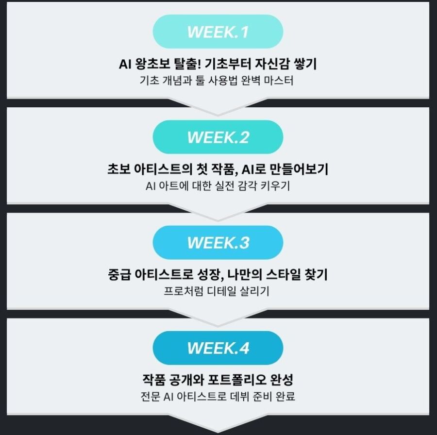4주 또는 8주 과정을 이수하면 AI 아티스트로 바로 데뷔하거나, 차기 강의에 즉시 활용할 수 있는 수준에 도달할 수 있습니다.